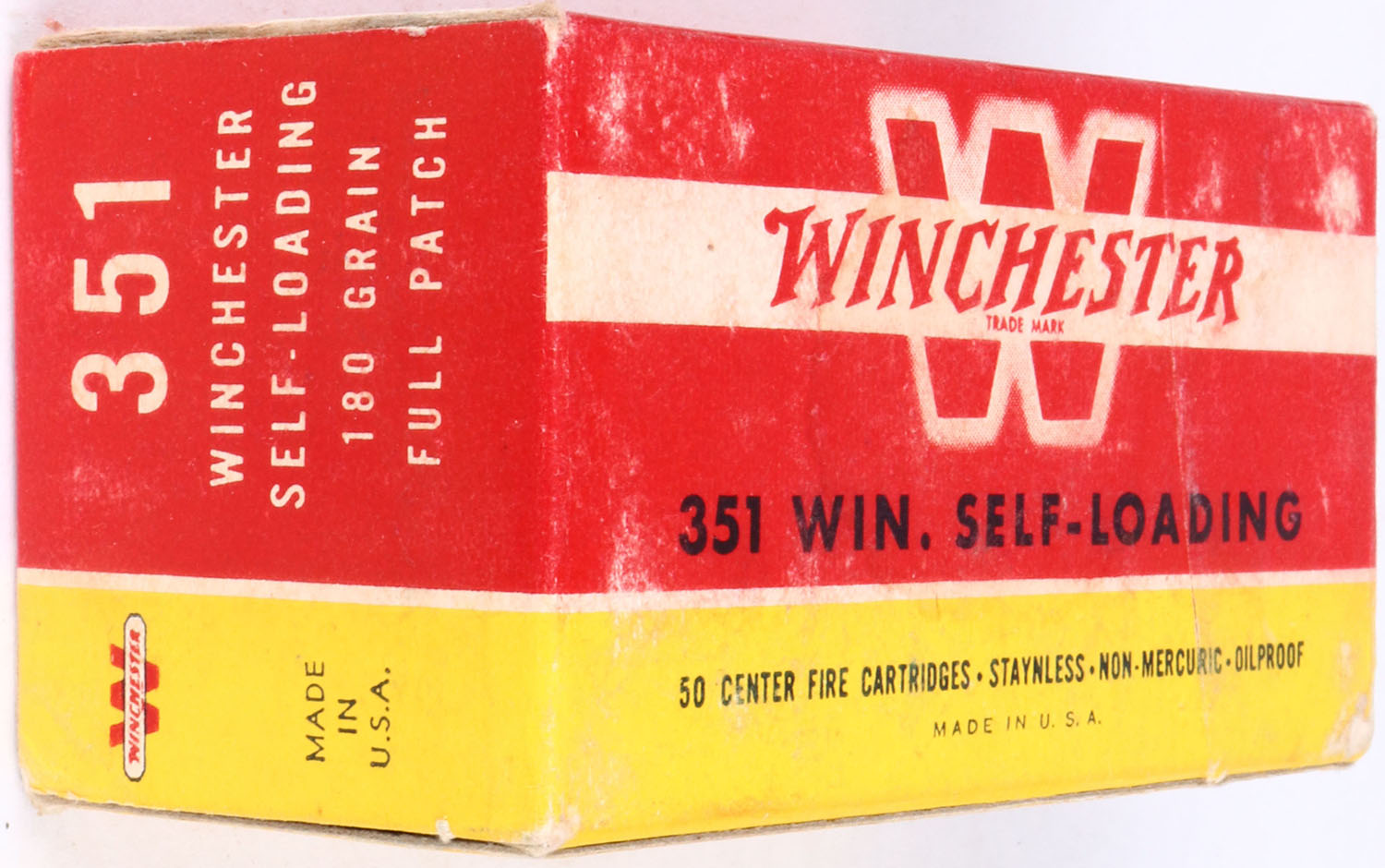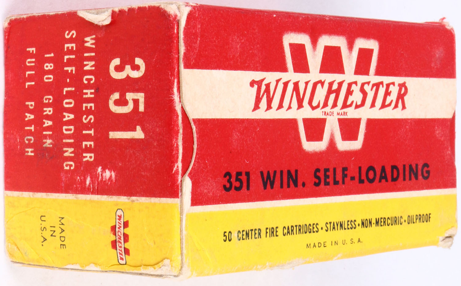 Winchester, .351 Win. Self-Loading, 180 Gr. Full patch Bullet, 1pc, Full, red & yellow box with white & black print, box is solid with light age soiling, rub marks, & edge/corner wear, ammo is excellent. Grade: Very Good ++ - Value: 100 to 200