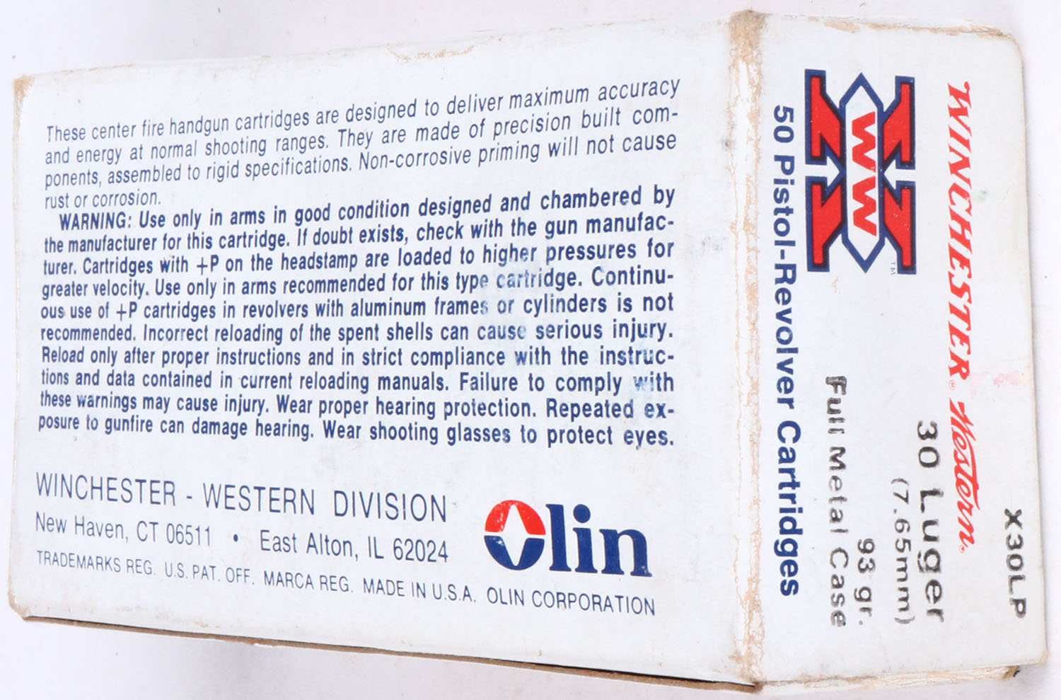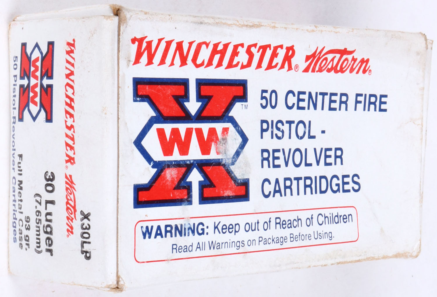 Winchester-Western, .30 Luger (7.65mm), 93 Gr. Full Metal case bullet, 1pc, Full, white box with black/red print, box is solid with rub marks & handling wear, ammo is excellent. Grade: Very Good ++ - Value: 40 to 80