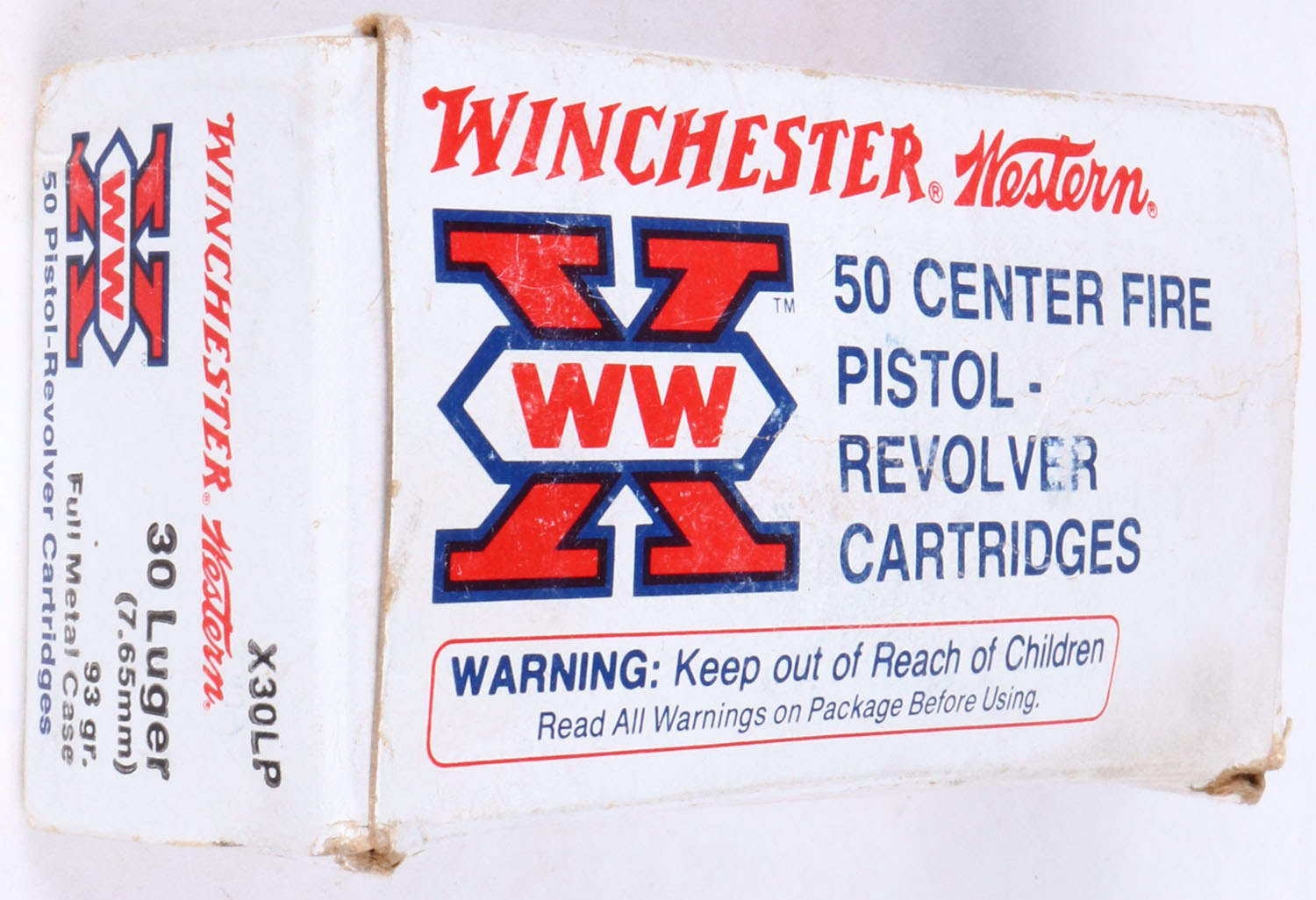 Winchester-Western, .30 Luger (7.65mm), 93 Gr. Full Metal case bullet, 1pc, Full, white box with black/red print, box is solid with rub marks & handling wear, ammo is excellent. Grade: Very Good ++ - Value: 40 to 80