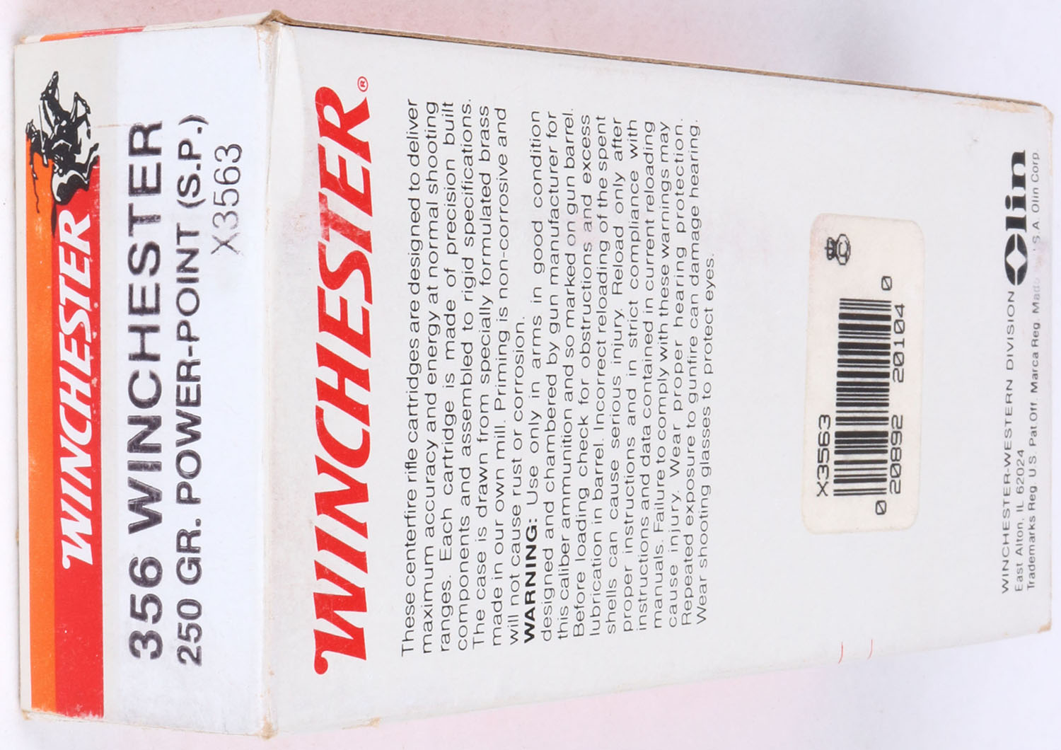 Winchester, Super-X, .356 Winchester, 250 Gr. Power Point (S.P.) bullet, 1pc, Full, white box with orange/red label & black/white print, box is solid with light wear & stickers, ammo is excellent. Grade: Excellent - Value: 30 to 90