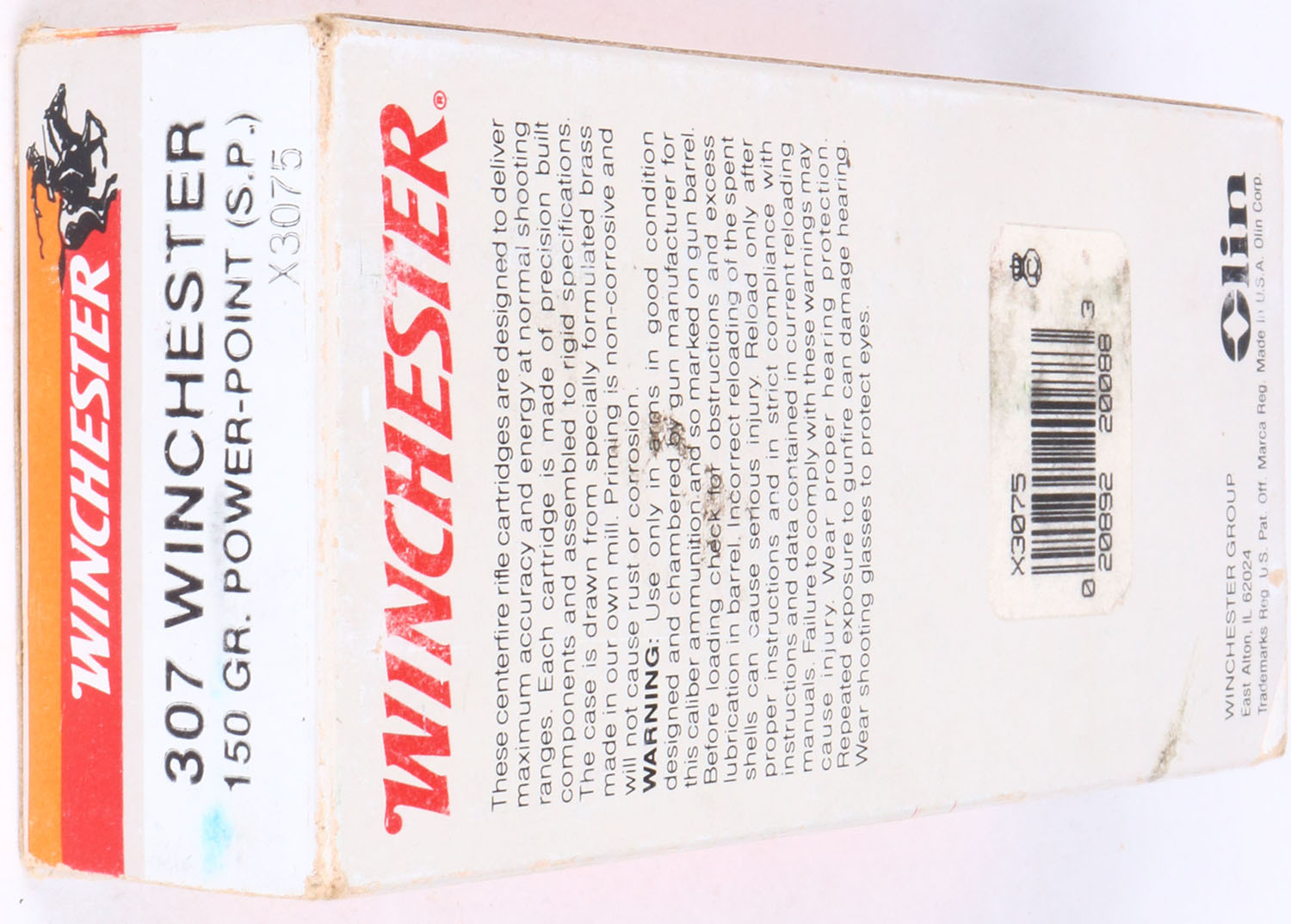 Winchester, Super-X, .307 Winchester, 150 Gr. Power Point (S.P.) bullet, 1pc, Full, white box with orange/red label & black/white print, box is solid with light wear & price sticker, ammo is excellent. Grade: Excellent - Value: 30 to 90
