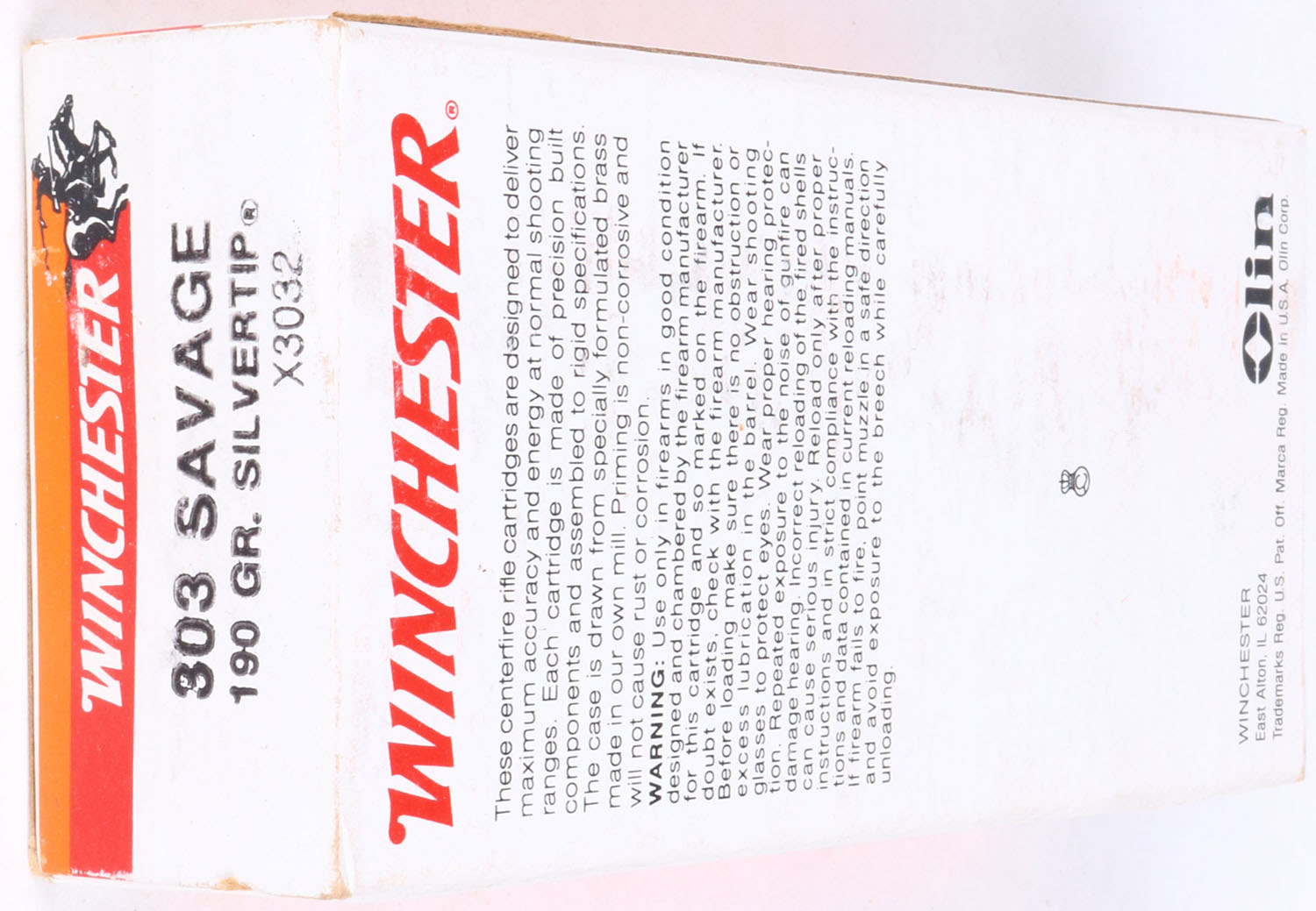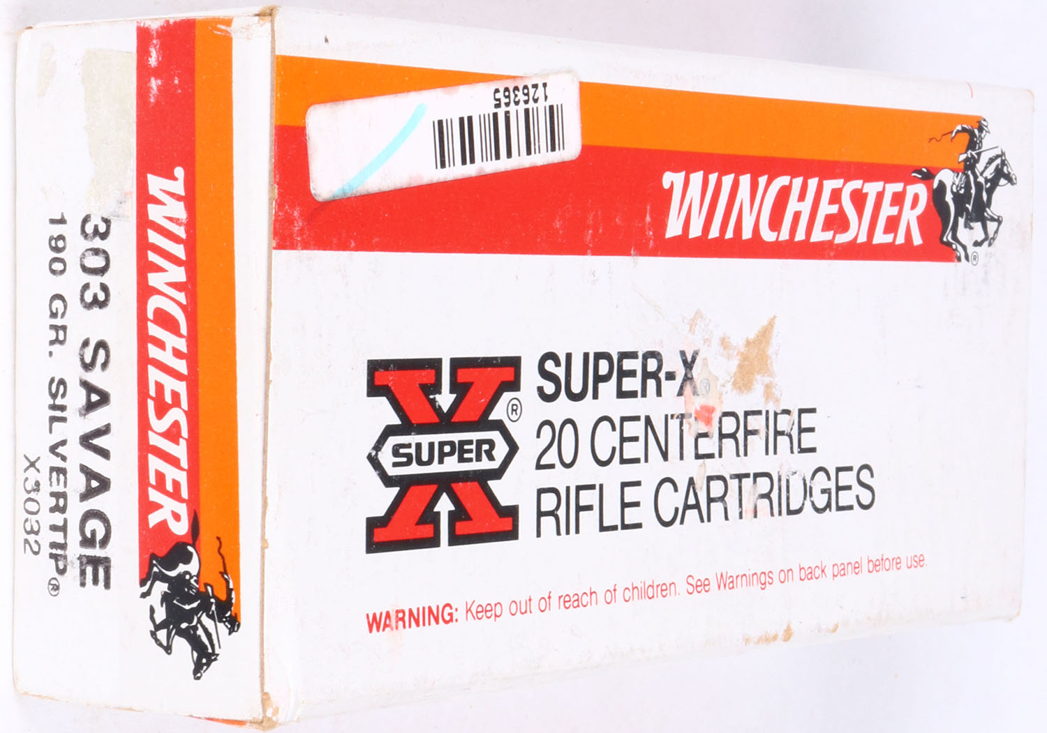 Winchester, Super-X, .303 Savage, 2190 Gr. Silvertip bullet, 1pc, Full, white box with orange/red label & black/white print, box is solid with light wear & stickers, ammo is excellent. Grade: Excellent - Value: 30 to 90