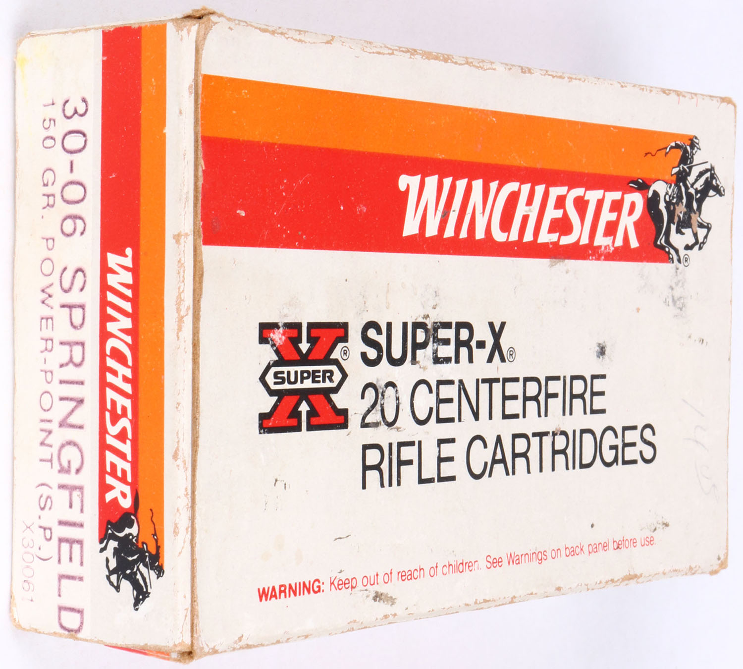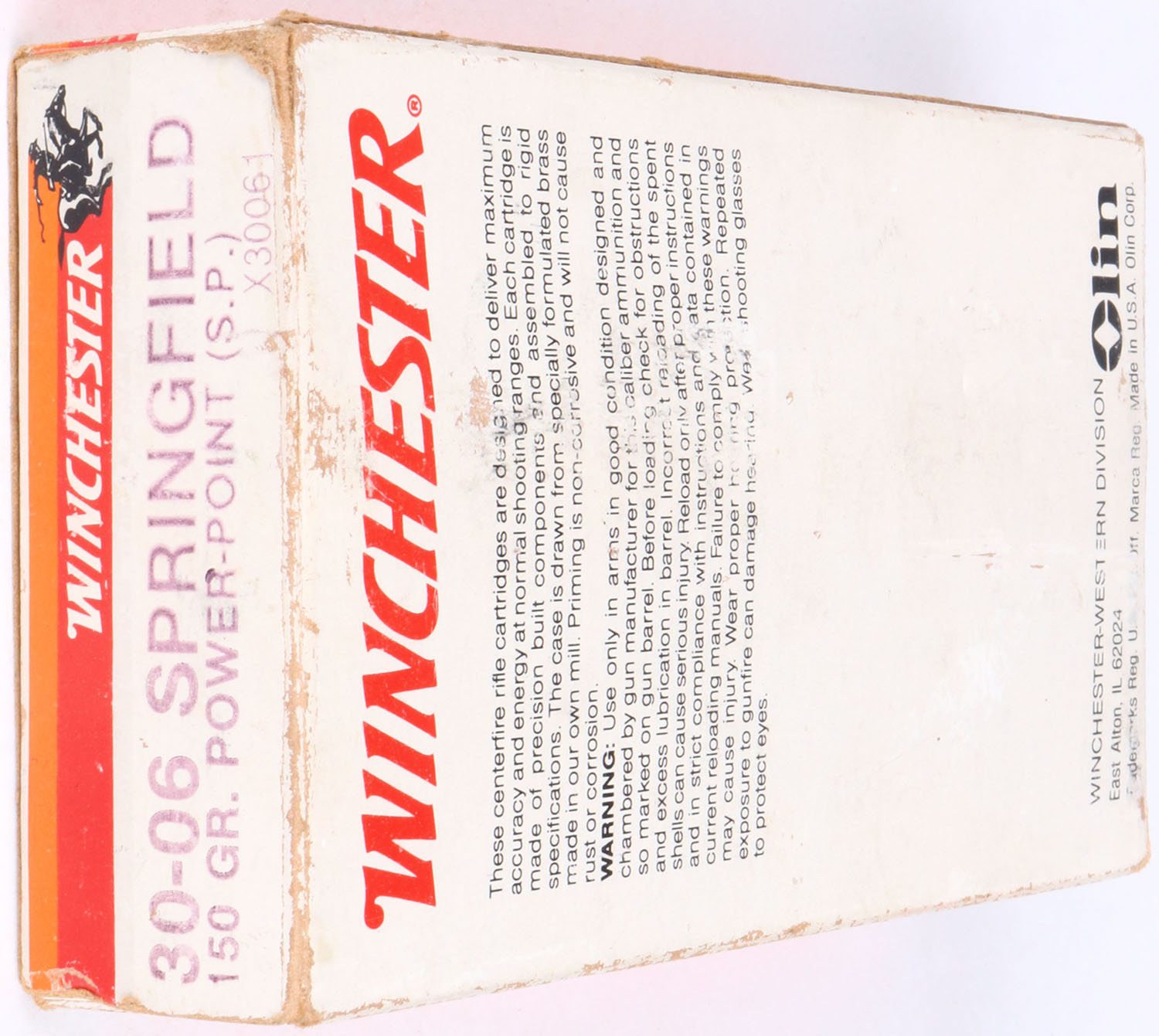 Winchester, Super-X, .30-06 Springfield, 150 Gr. Power-Point (S.P.) bullet, 1pc, Full with 1 Rd. of R-P, Gray box with orange/red label & black/white print, box is solid with light wear, age soiling, & pencil marks, ammo is very good. Grade: Excellent - Value: 30 to 60
