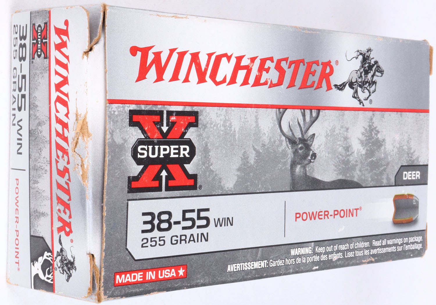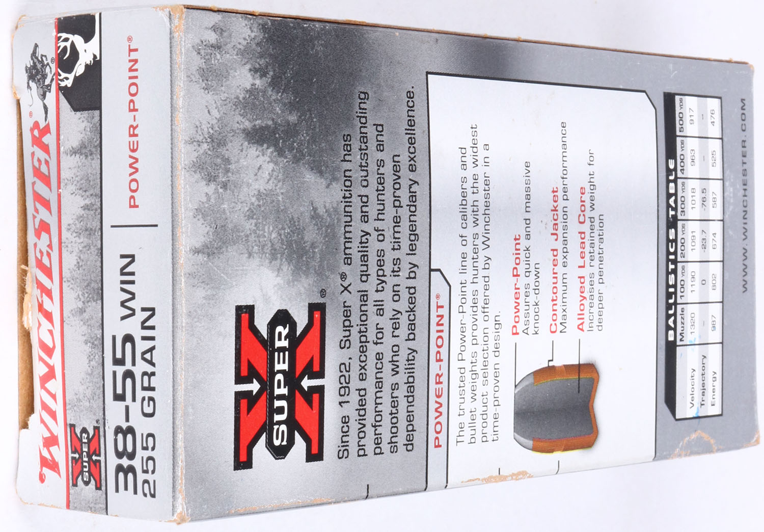 Winchester, Super-X, .38-55 Win., 255 Gr. Power Point bullet, 1pc, Full, gray box with black/red print, box is solid with light wear, ammo is excellent. Grade: Excellent - Value: 30 to 90