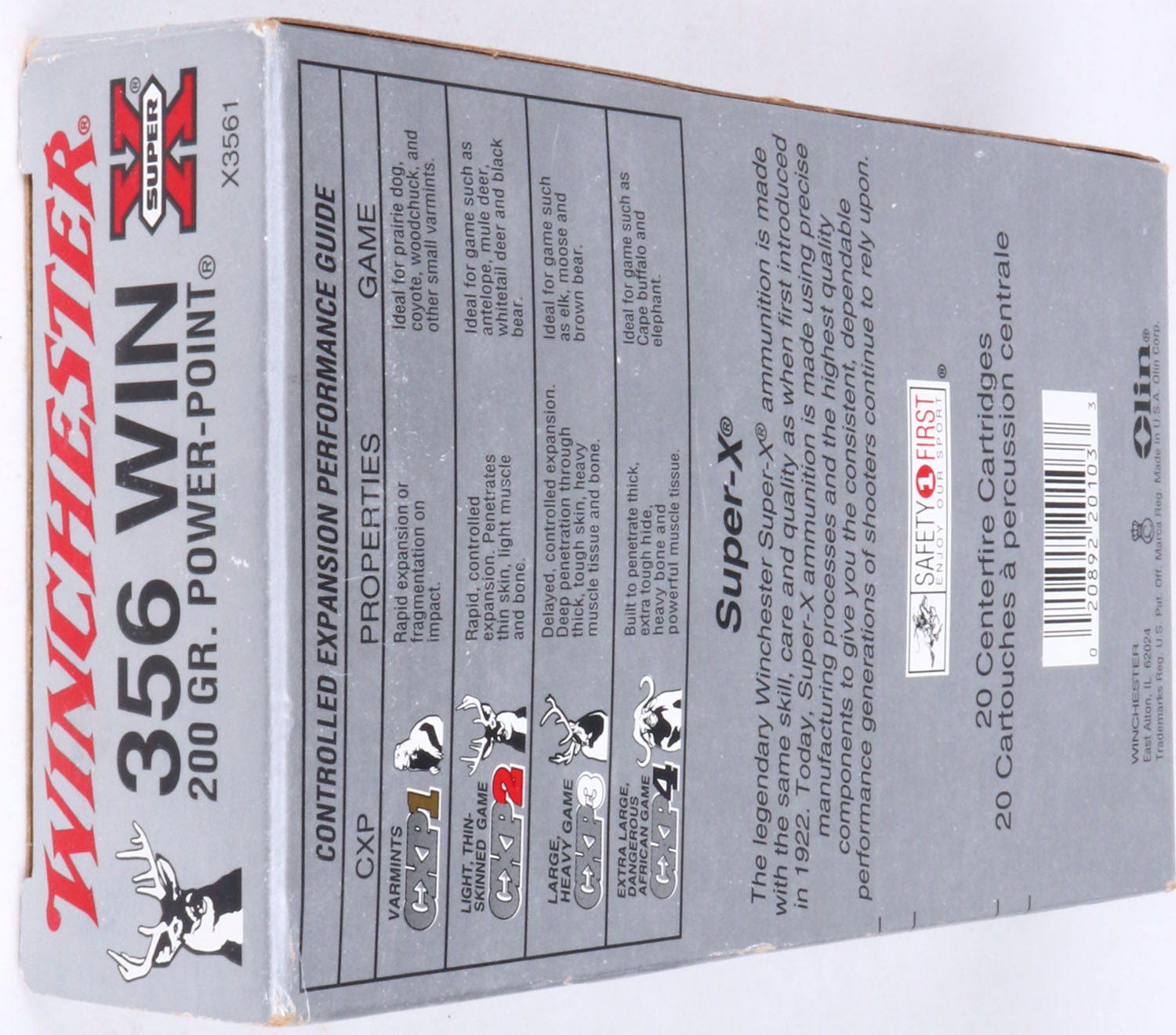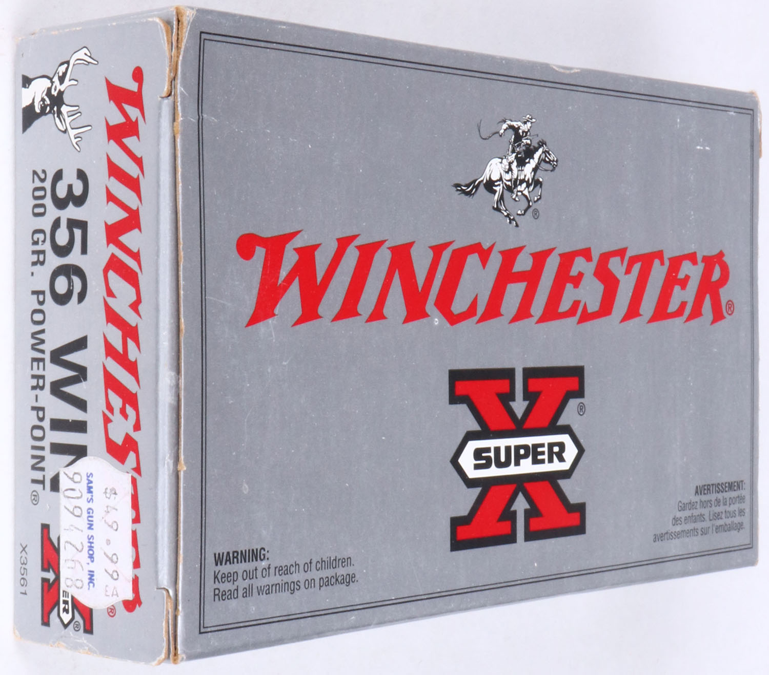 Winchester, Super-X, .356 Win., 200 Gr. Power Point bullet, 1pc, Full, gray box with black/red print, box is solid with light wear & price sticker, ammo is excellent. Grade: Excellent - Value: 30 to 90