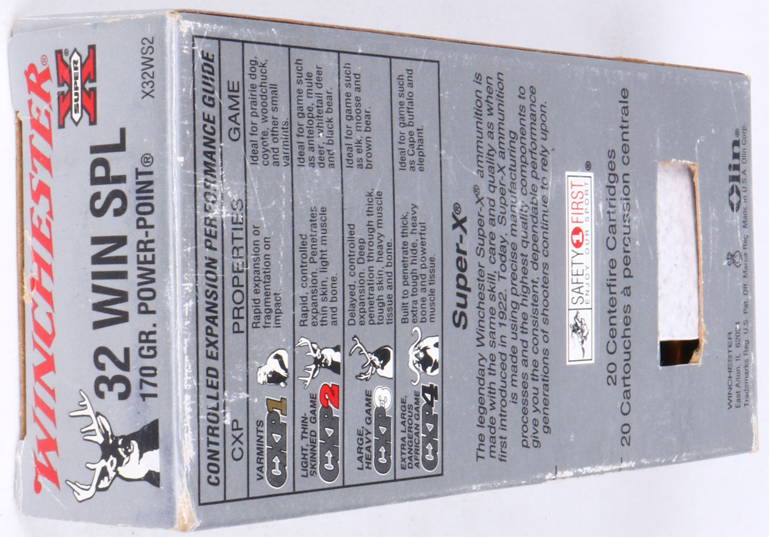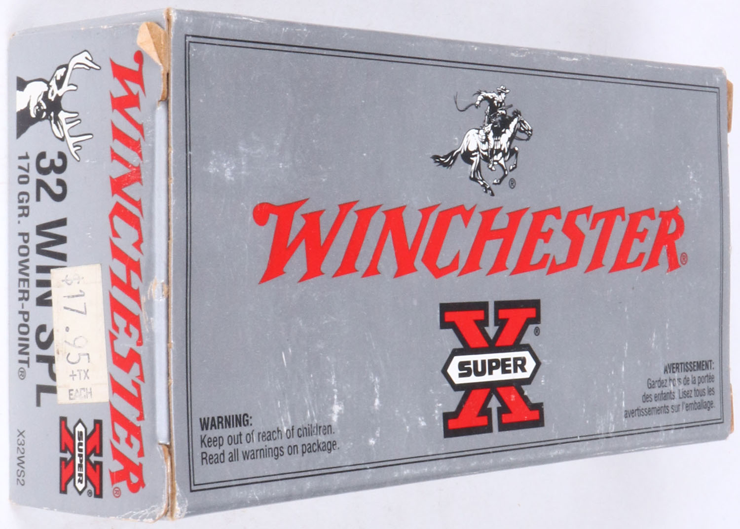 Winchester, Super-X, .32 Win. SPL., 170 Gr. Power Point bullet, 1pc, Full, gray box with black/red print, box is solid with light wear, hole cut in bottom of box, & price sticker, ammo is excellent. Grade: Very Good ++ - Value: 30 to 90