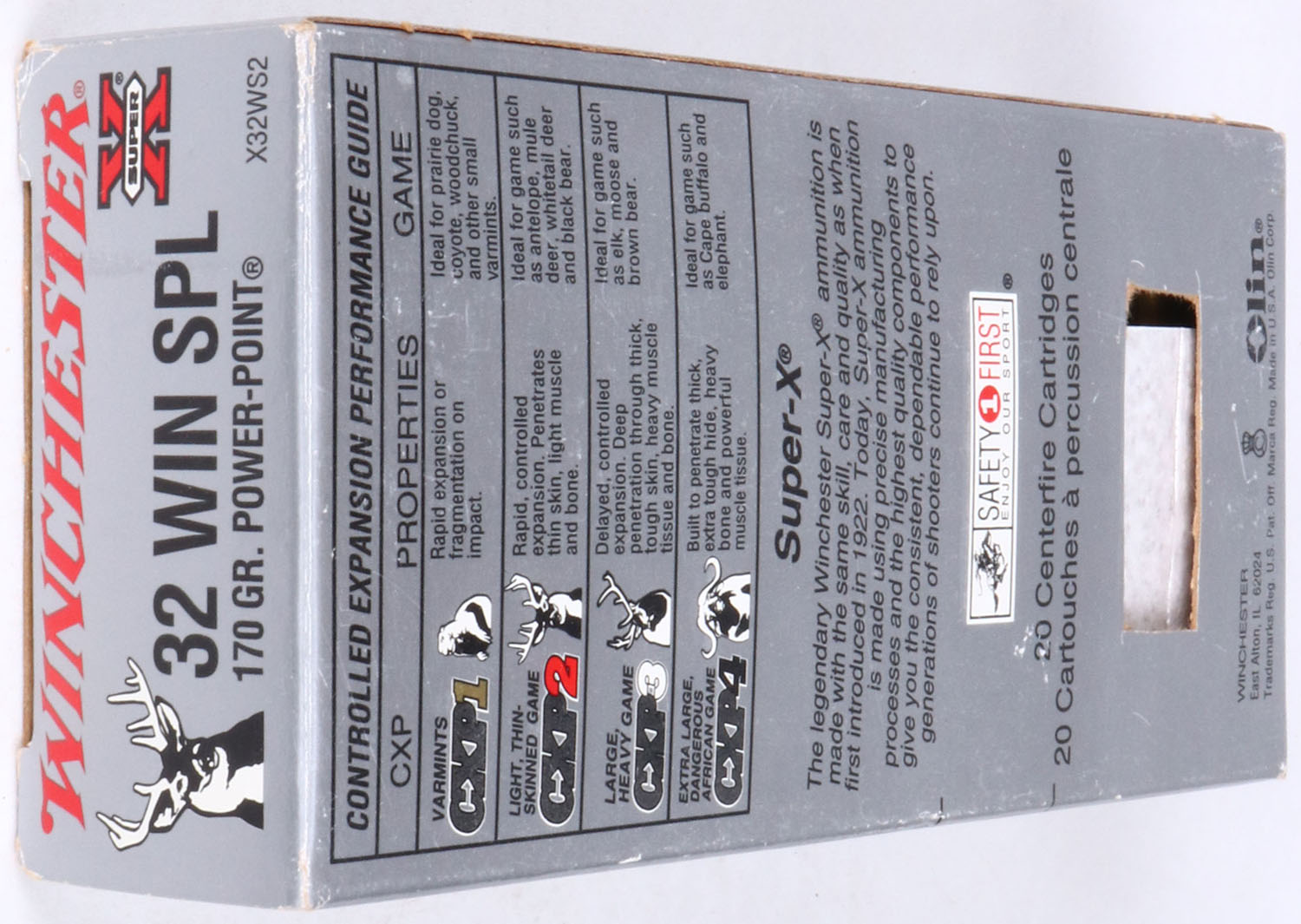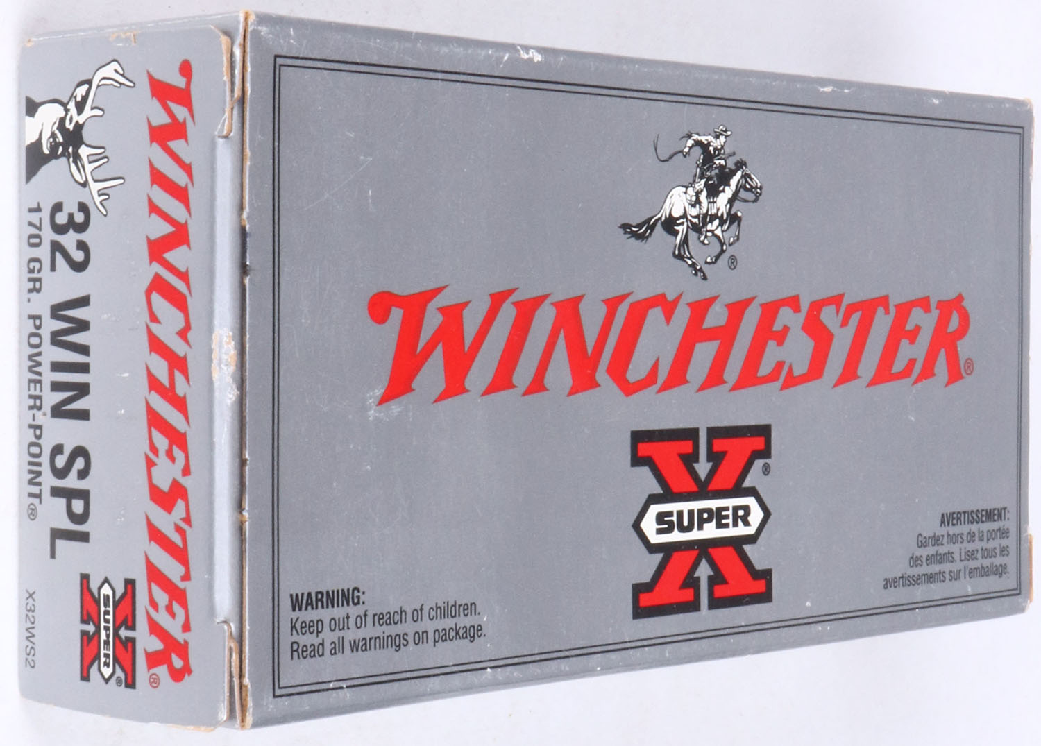 Winchester, Super-X, .32 Win. SPL., 170 Gr. Power Point bullet, 1pc, Full, gray box with black/red print, box is solid with light wear, & hole cut in bottom of box, ammo is excellent. Grade: Very Good ++ - Value: 30 to 90