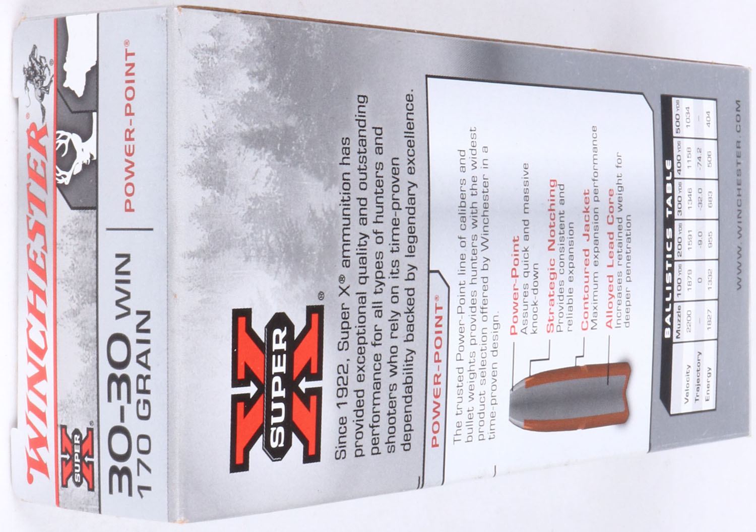 Winchester, Super-X, .30-30 Win., 170 Gr. Power Point bullet, 1pc, Full, gray box with black/red print, box is solid with light wear, ammo is excellent. Grade: Excellent - Value: 20 to 40