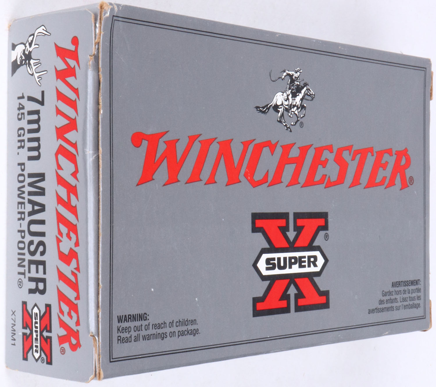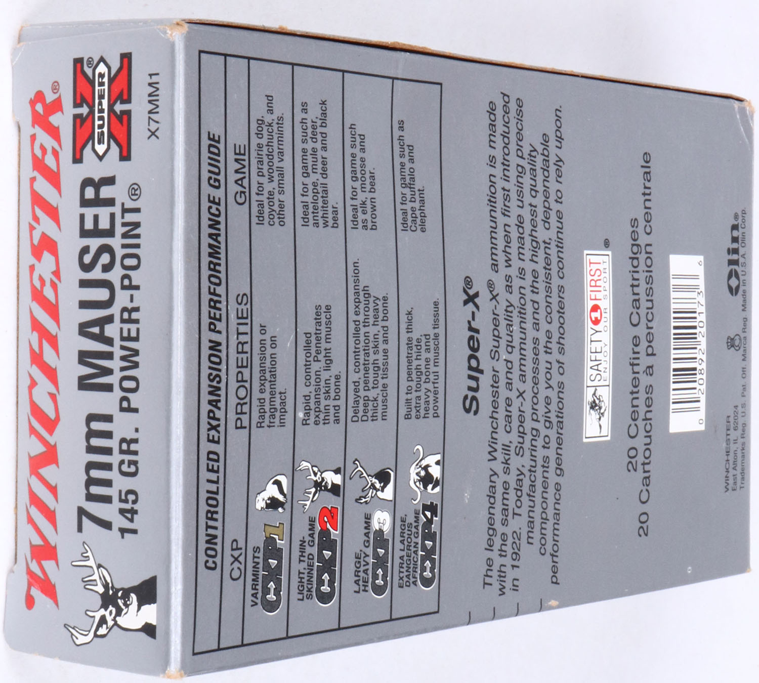 Winchester, Super-X, 7mm Muser, 145 Gr. Power Point bullet, 1pc, Full, gray box with black/red print, box is solid with light wear, ammo is excellent. Grade: Excellent - Value: 20 to 40