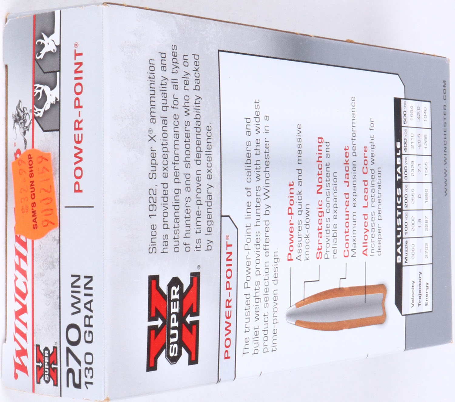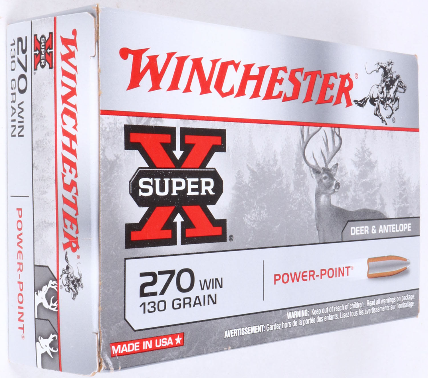 Winchester, Super-X, .270 Win., 130 Gr. Power Point bullet, 1pc, Full, gray box with black/red print, box is solid with light wear, ammo is excellent. Grade: Excellent - Value: 20 to 40