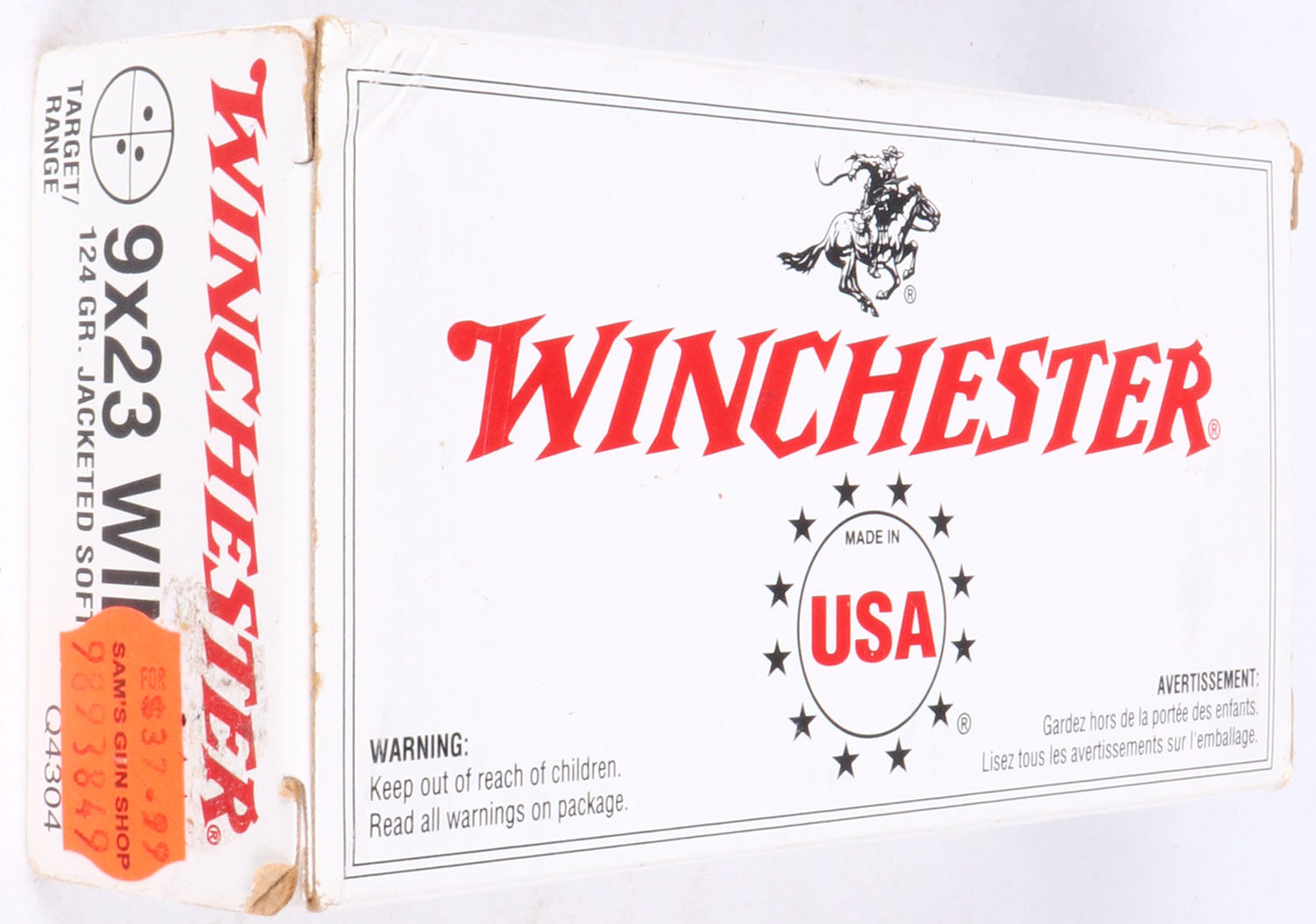 Winchester, .9x23 Win., 124 Gr. Jacketed soft point, 1pc, Full, white box with black/red print, box is solid with light wear, ammo is excellent. Grade: Excellent - Value: 30 to 60