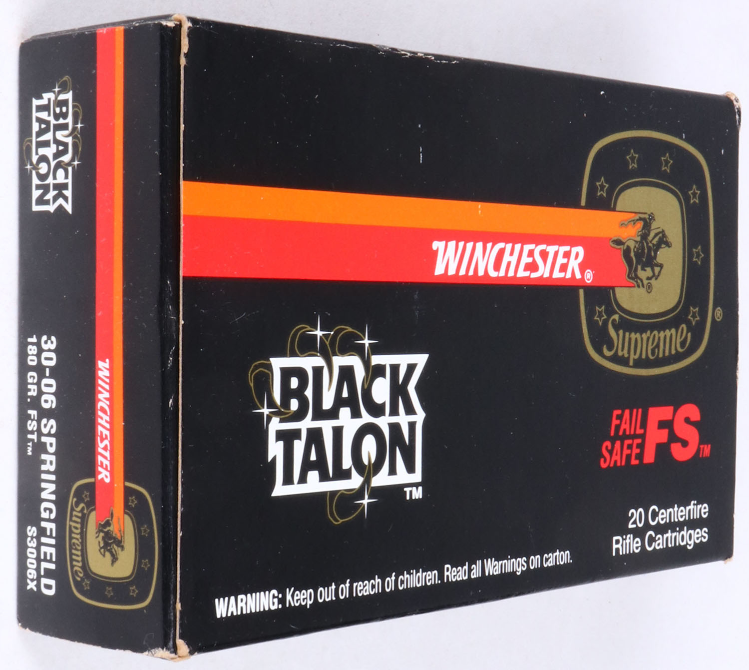 Winchester, Black Talon, .30-06 Springfield, 180 Gr. FST bullet, 1pc, Full, black box with orange/red label & red/white print, box is solid with light wear, ammo is excellent. Grade: Excellent - Value: 40 to 80