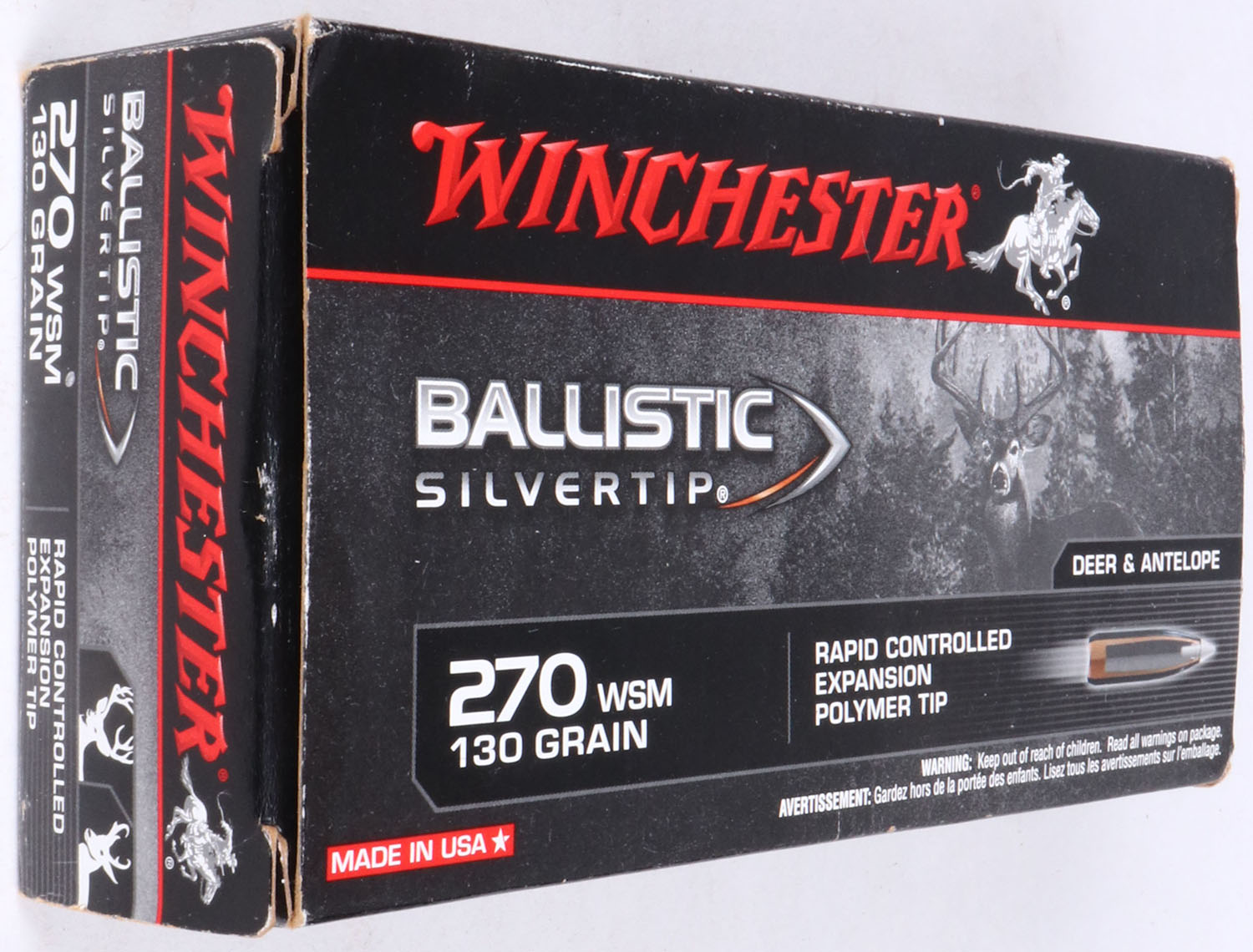 Winchester, Silvertip, .270 WSM, 130 Gr. Rapid controlled expansion polymer tip bullet, 1pc, Full, black box with white/red label & red/white print, box is solid with light wear, ammo is excellent. Grade: Excellent - Value: 30 to 90