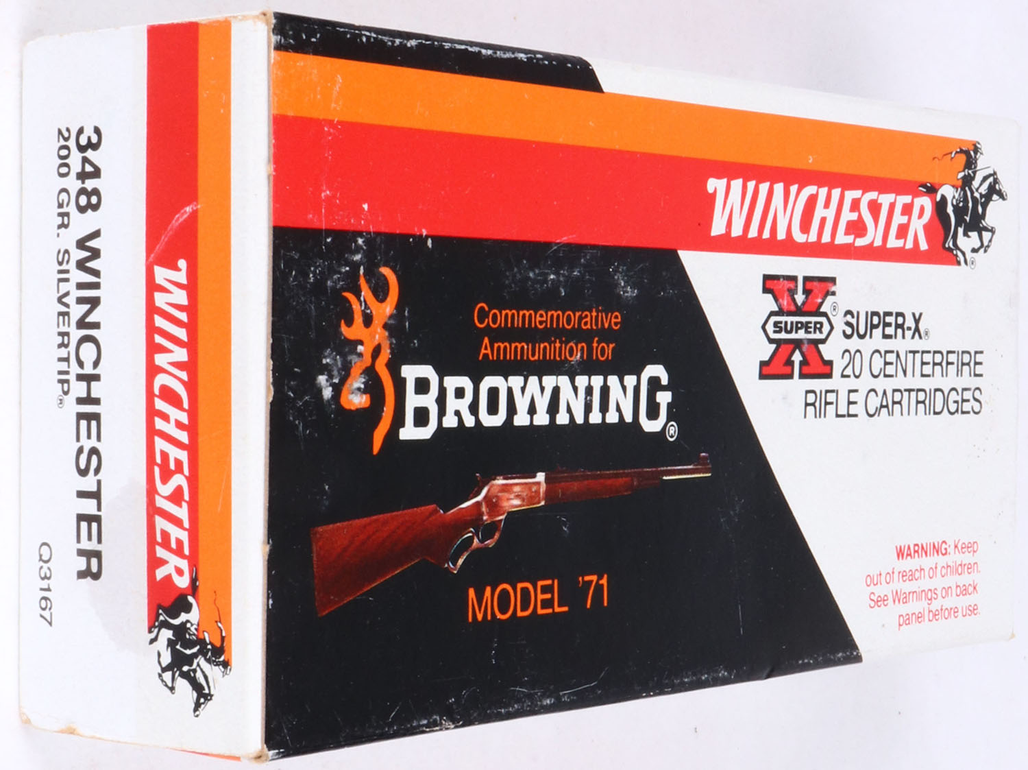 Winchester, Super-X, Commemorative Ammunition for Browning Model '71, .348 Winchester, 200 Gr. Silvertip, Full, 1pc., multi-colored box, box is solid with excellent color, light shelf wear, ammo is excellent. Grade: Excellent + - Value: 60 to 120