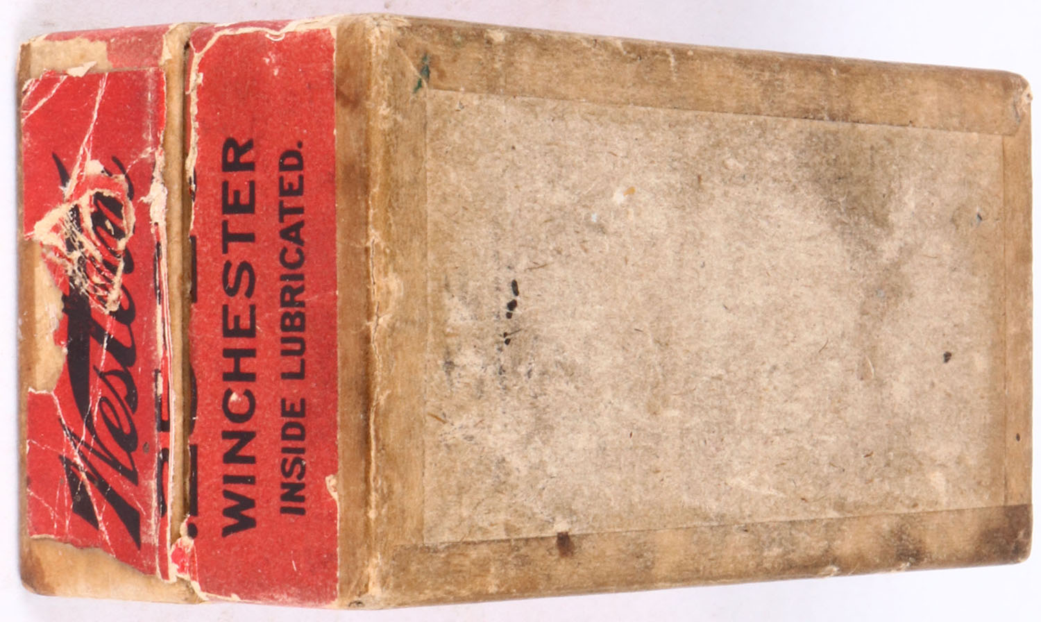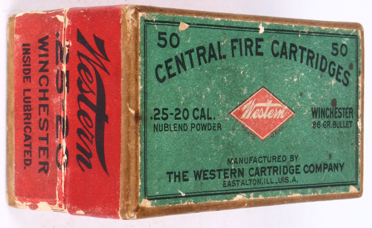 Western, .25-20 Winchester, Nublend Powder, 86 Gr. Bullet, 2pc, partial 40 Rds., buff box with green/red label & black print, box is solid light age soiling, light rub marks, & light edge wear, ammo is very good. Grade: Excellent - Value: 60 to 120
