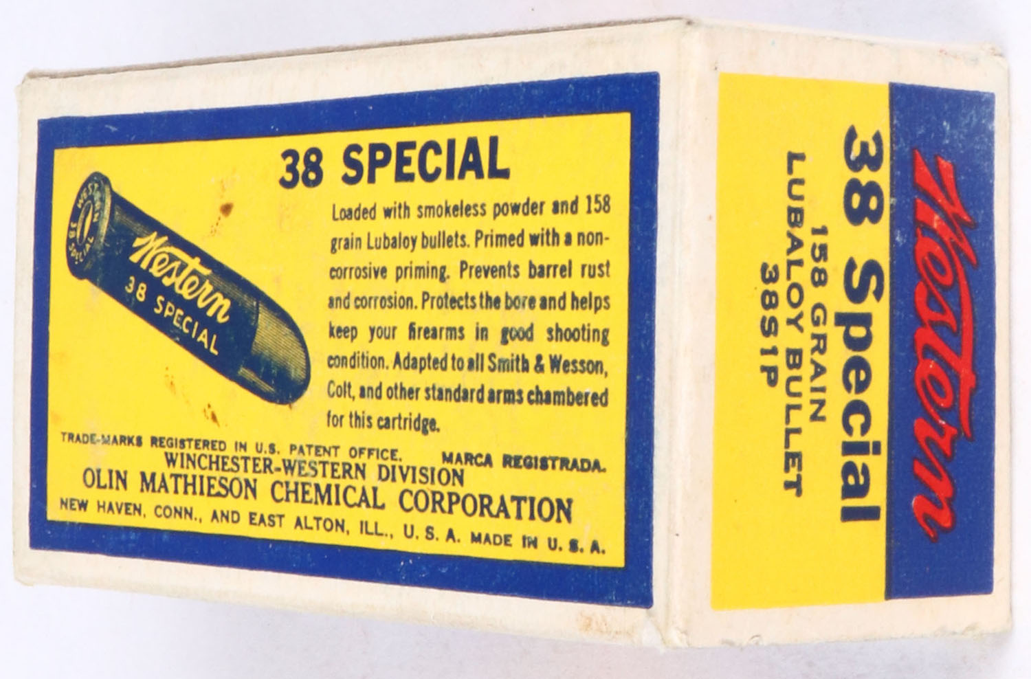 Western, Bullseye, .38 Special, 158 Gr. Lubaloy bullet, 1pc, Full with all R-P H/S'S, buff box with yellow/blue label & black/red/white print, box is solid with MINT color & Little to no wear, ammo is excellent. Grade: MINT - Value: 50 to 150