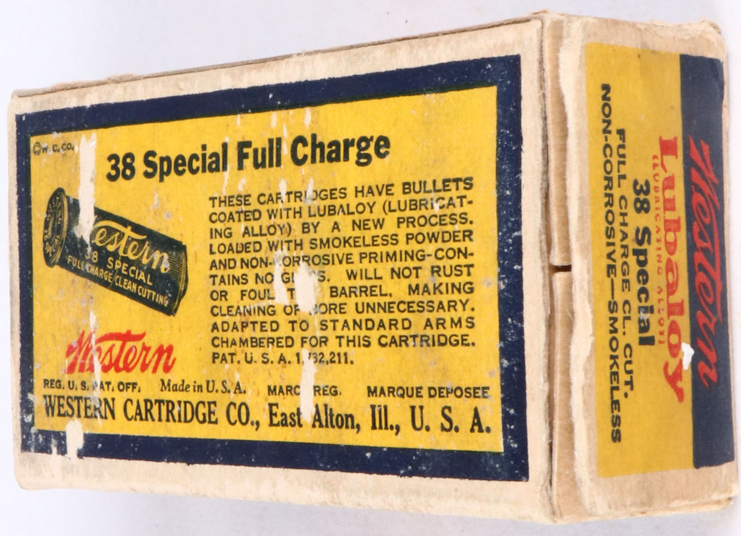 Western, Bullseye, .38 Special, 148 Gr. Lubaloy Clean cutting coated bullet, 1pc, Full, buff box with yellow/blue label & black/red/white print, box is solid with light age soiling, right end flap is detached, rub marks, & edge wear, ammo is very good. Grade: Very Good + - Value: 50 to 100