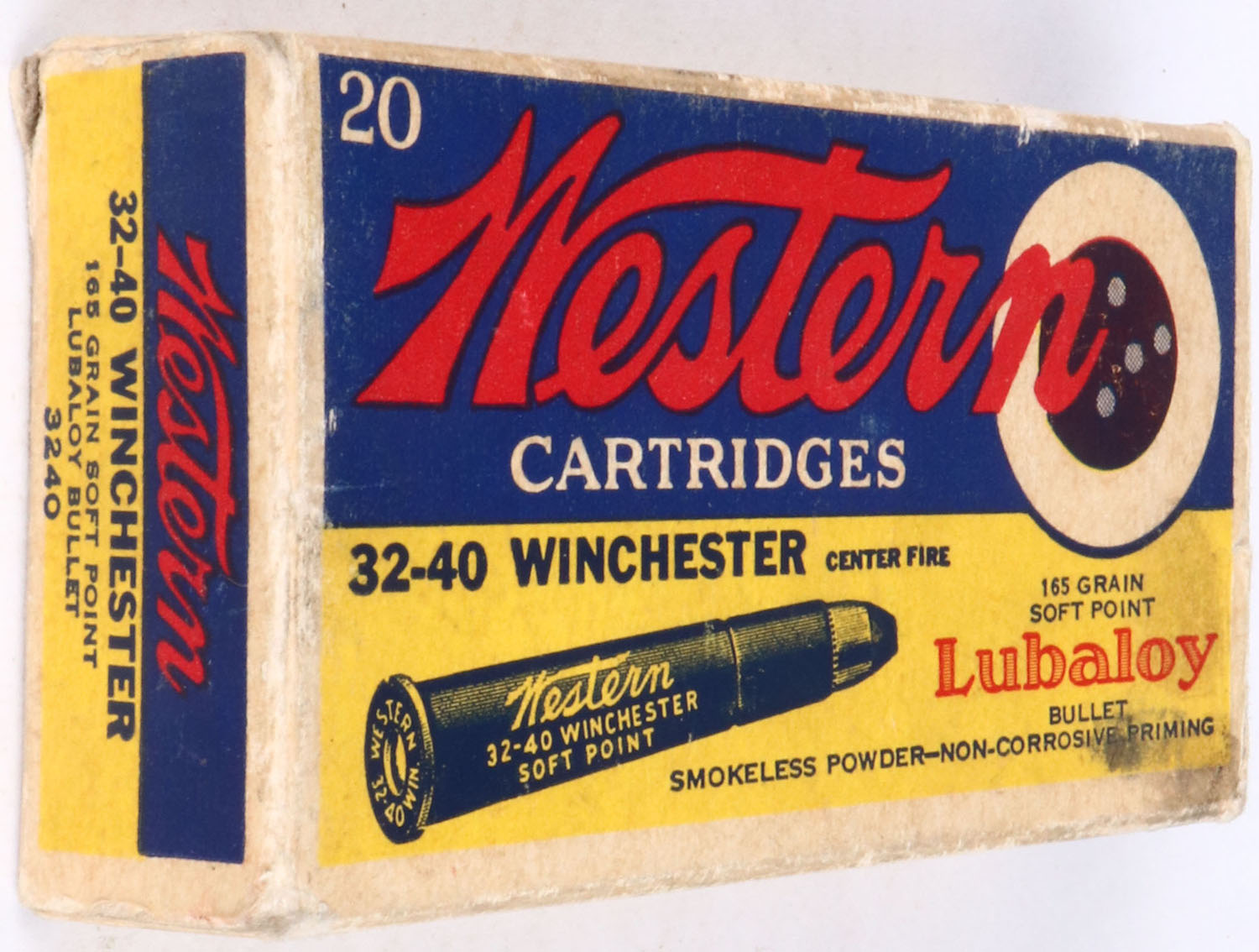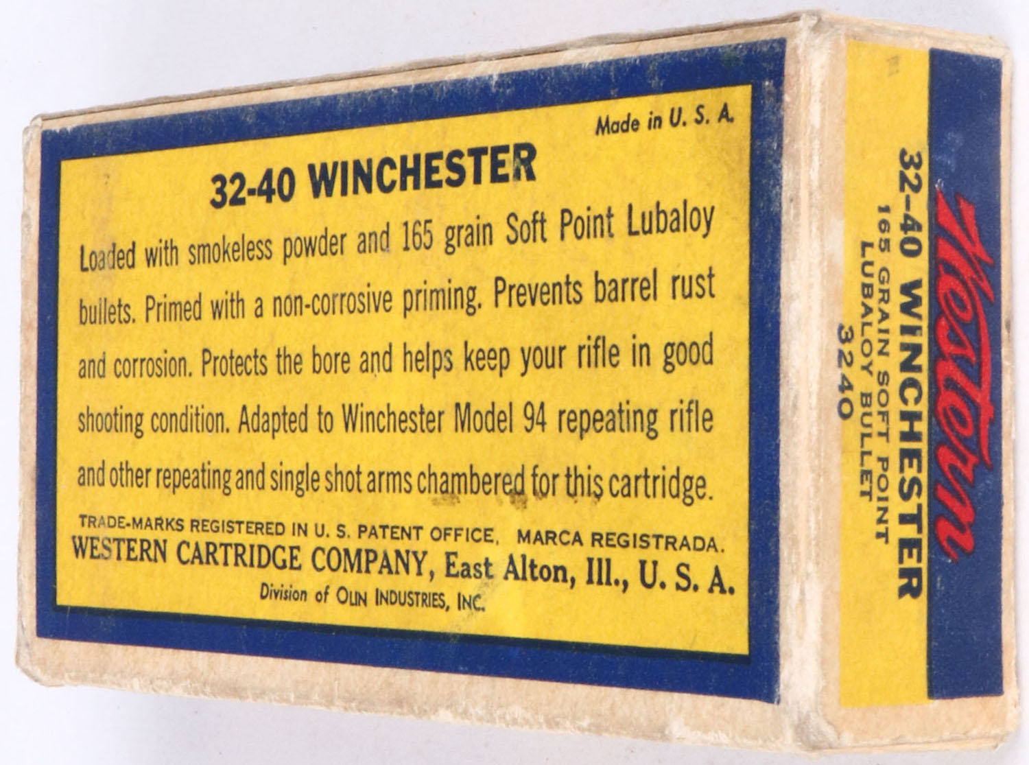 Western, Bullseye, .32-40 Winchester, 165 Gr. Lubaloy soft point bullet, 1pc, Full with one WRA H/S, buff box with yellow/blue label & black/red/white print, box is solid with very good color, rub marks, & edge wear, ammo is very good. Grade: Excellent - Value: 80 to 160