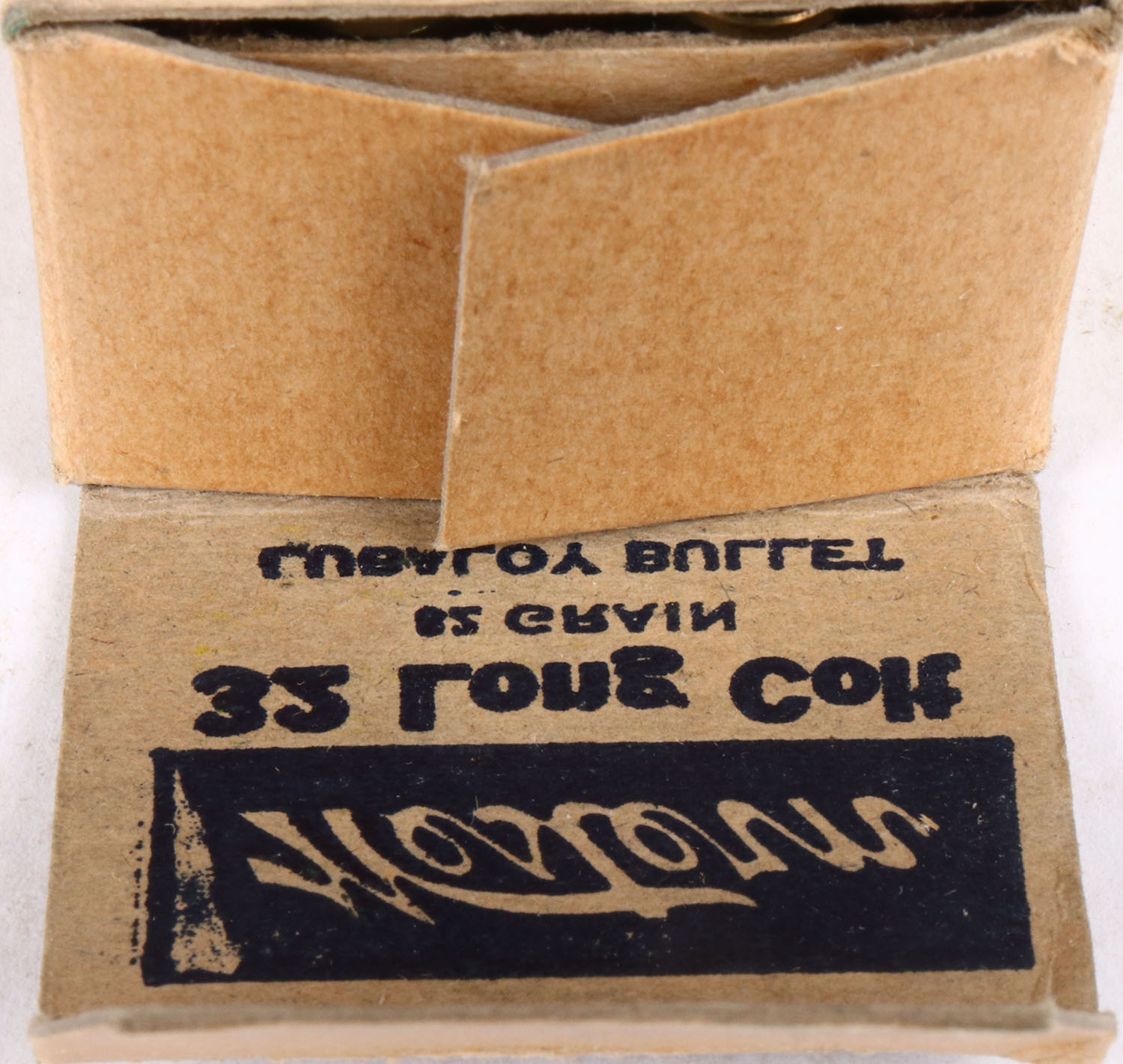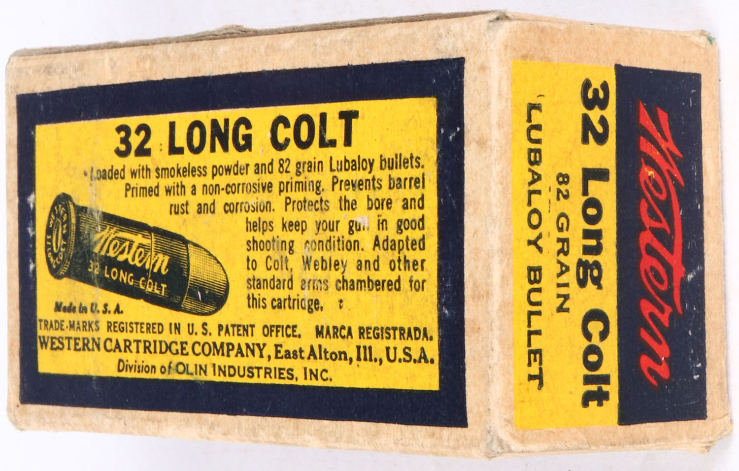 Western, Bullseye, .32 Long Colt, end labels have bleed through to the inside of the box, 82 Gr. Lubaloy bullet, 1pc, Full, buff box with yellow/blue label & black/red/white print, box is solid with minor age soiling, light rub marks, & edge wear, ammo is excellent. Grade: Excellent - Value: 50 to 200