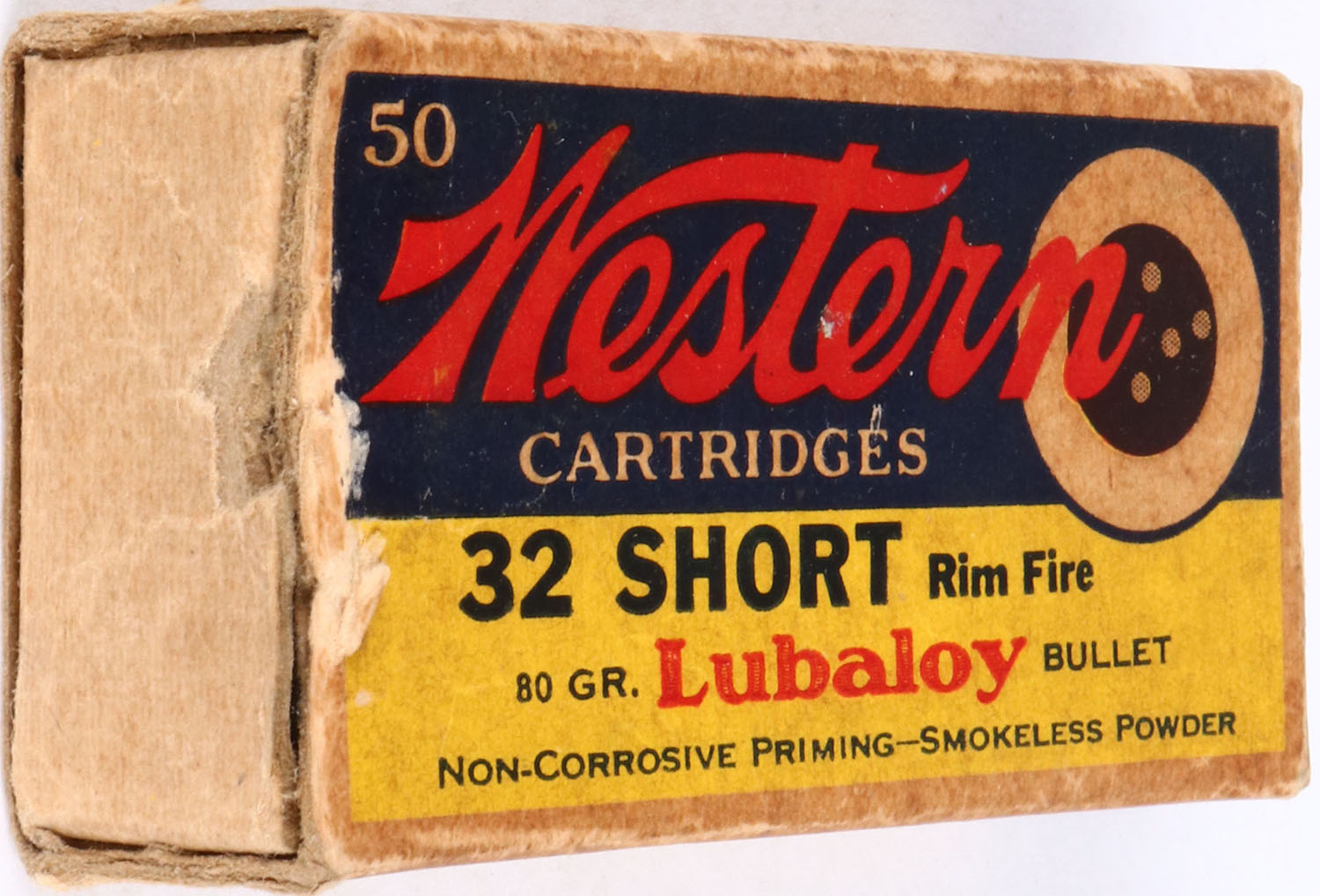 Western, Bullseye, .32 short, 80 Gr. Lubaloy Greased bullet, 1pc, Partial 30 Rds., buff box with yellow/blue label & black/red/white print, box is missing left end flap. minor age soiling, light rub marks, & edge wear, ammo is very good. Grade: Very Good + - Value: 30 to 60