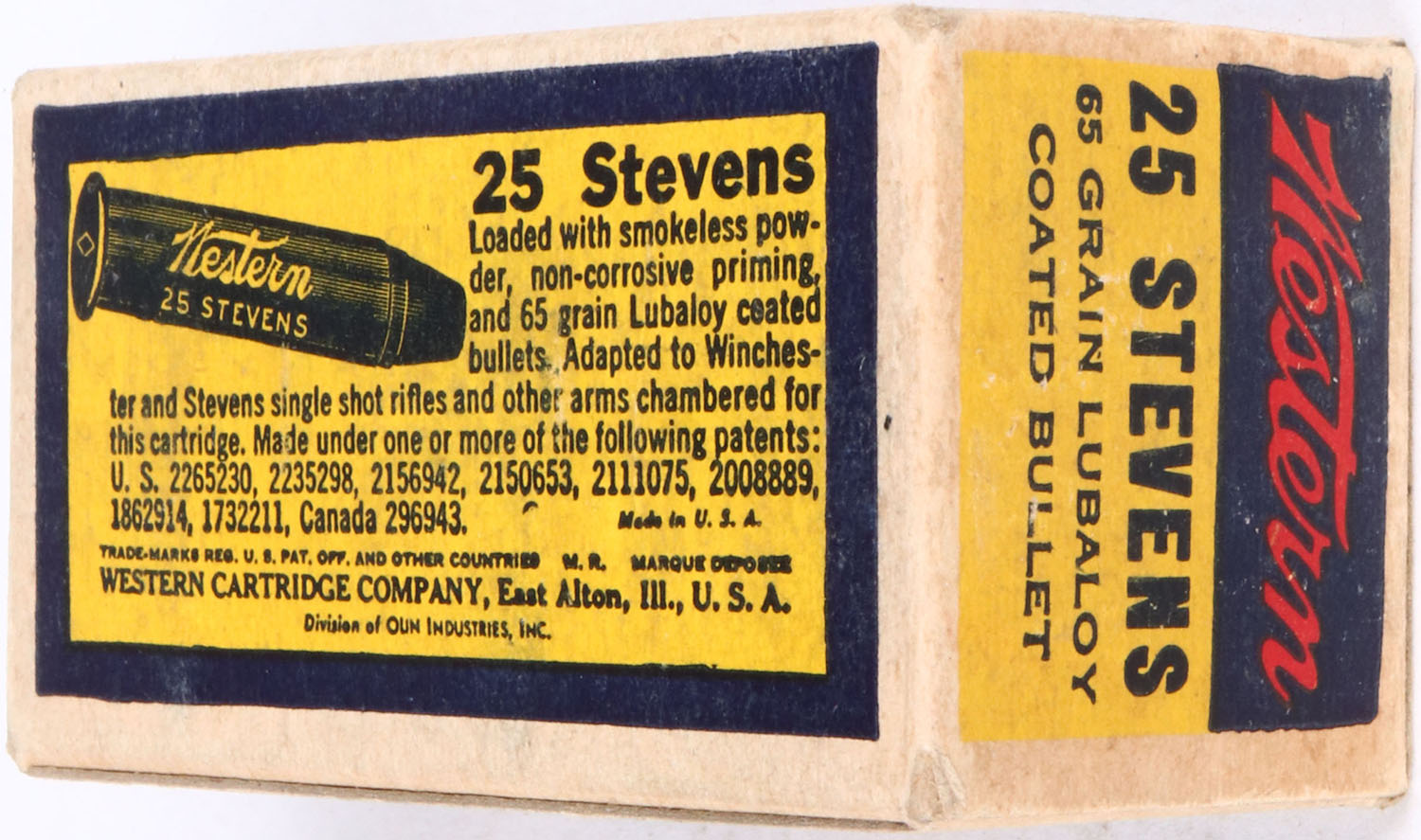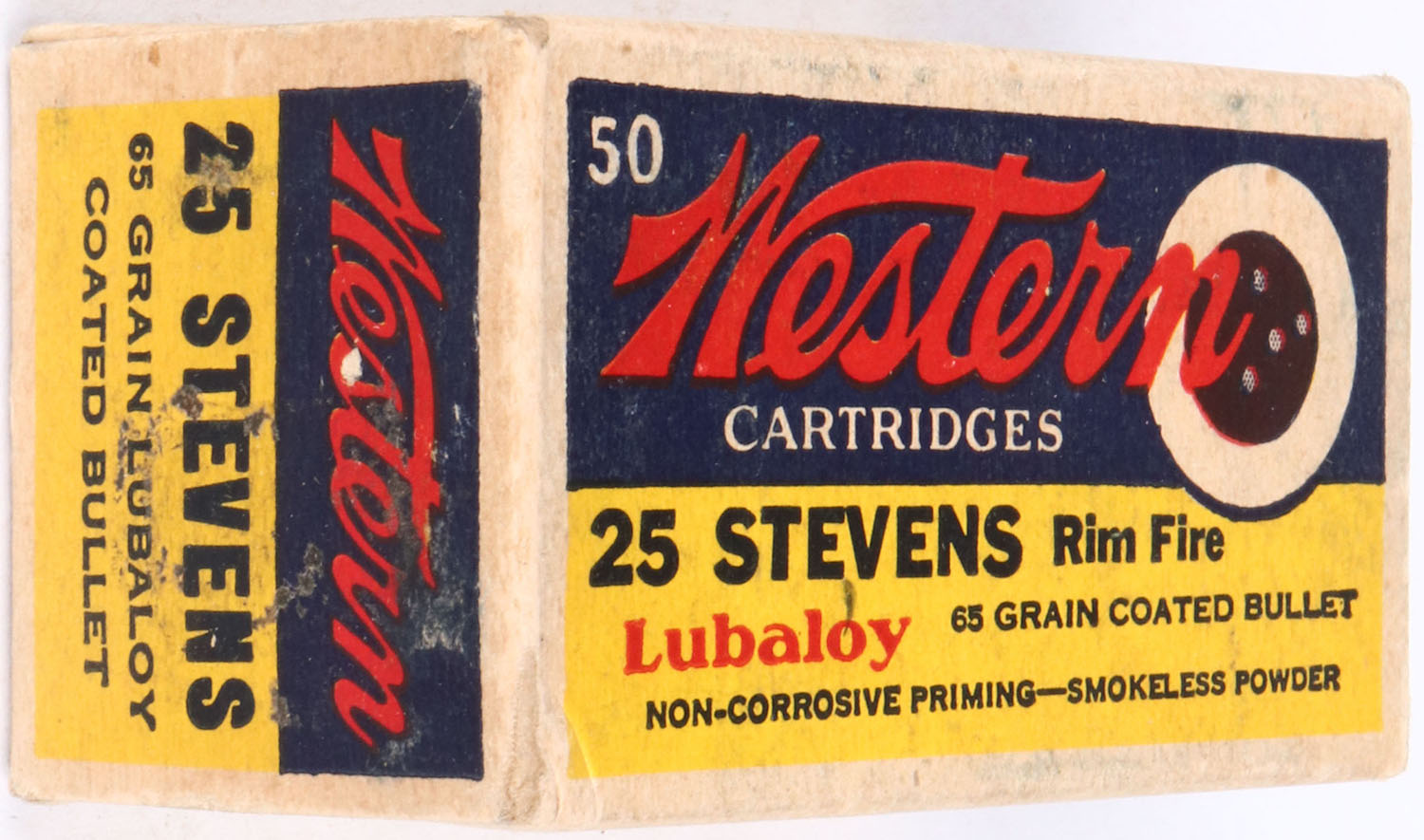 Western, Bullseye, .25 stevens R.F., 65 Gr. Lubaloy coated bullet, 1pc, Full, buff box with yellow/blue label & black/red/white print, box is solid with minor age soiling, light rub marks, & edge wear, ammo is very good. Grade: Excellent - Value: 50 to 100