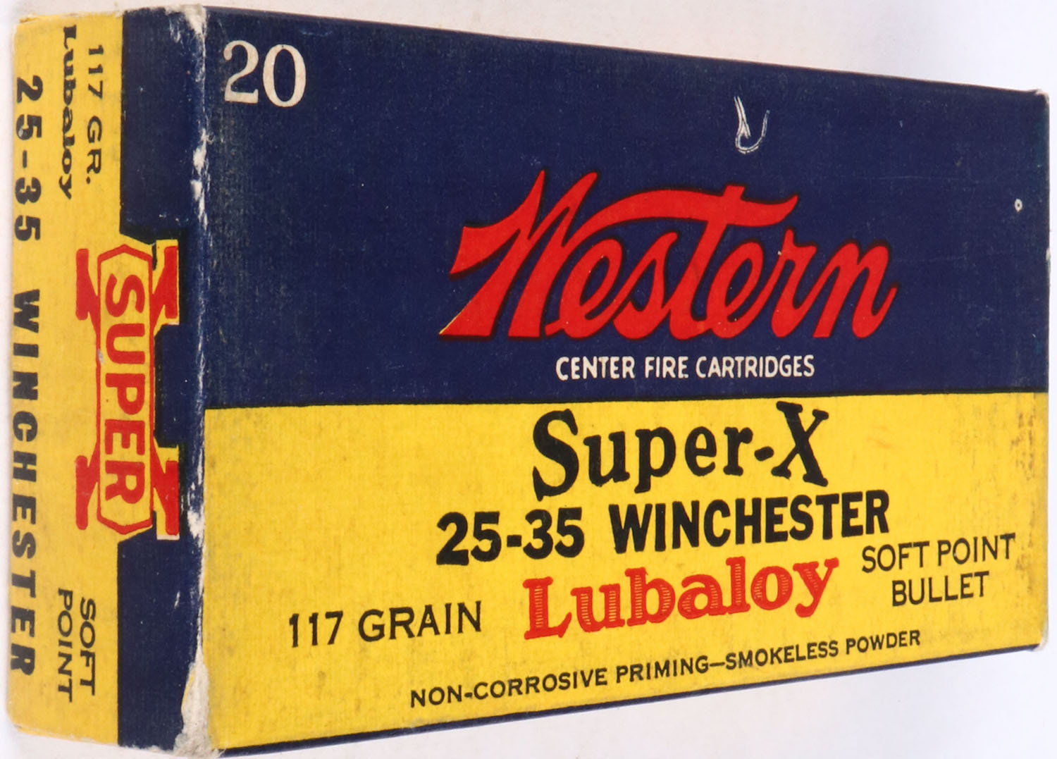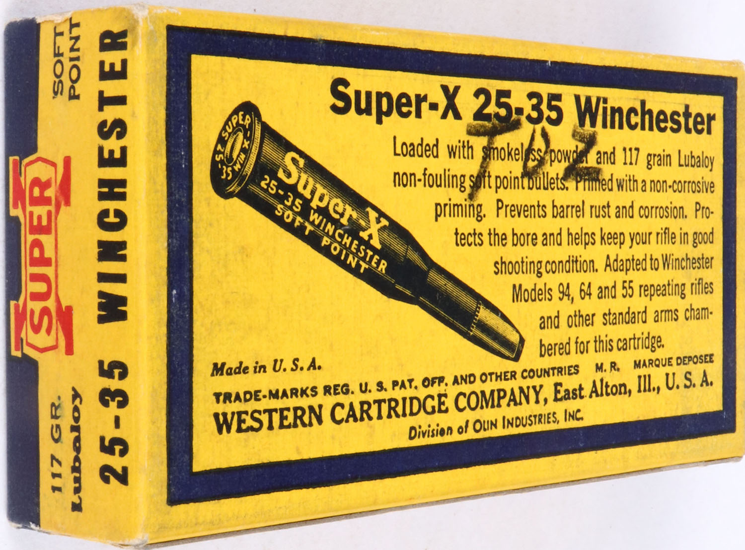 Western, SUPER-X, .25-35 Winchester, 117 Gr. Lubaloy soft point bullet, 1pc, Full, buff box with yellow/blue label & black/red/white print, box is solid with very good color, pen marks on bottom, light rub marks & light edge wear, ammo is very good. Grade: Excellent + - Value: 40 to 80