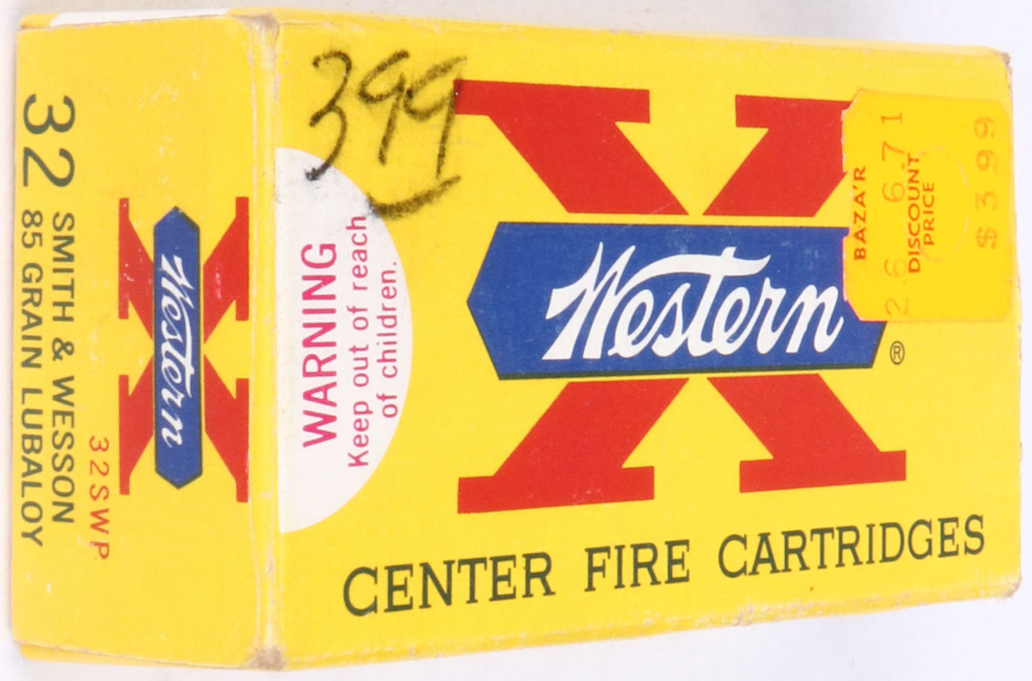 Western, Super-X, .32 S.&W., 85 Gr. LUBALOY inside lubricated Bullet, 1pc, Partial around 40 Rds., yellow box with white label & black/red/blue print, box is solid with sticker on front, pen marks, light rub wear & light edge/corner wear, ammo is very good. Grade: Very Good ++ - Value: 30 to 60