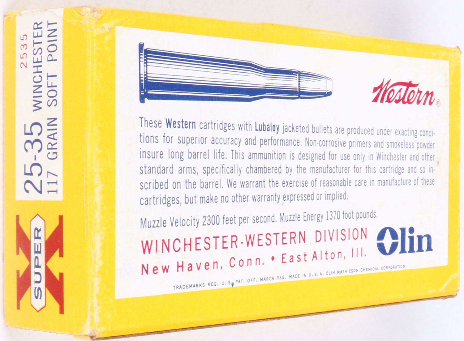 Western, Super-X, .25-35 Winchester, 117 Gr. Soft point bullet, 1pc, Full, yellow box with white label & red/black print, box is solid with rub marks, & light edge wear, ammo is excellent. Grade: Excellent - Value: 50 to 150