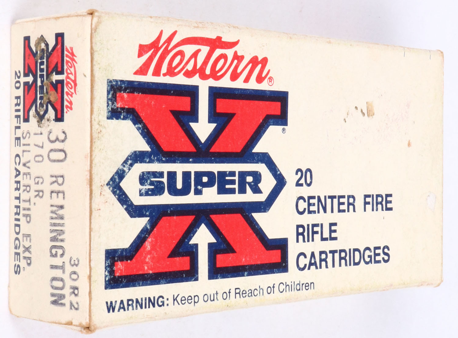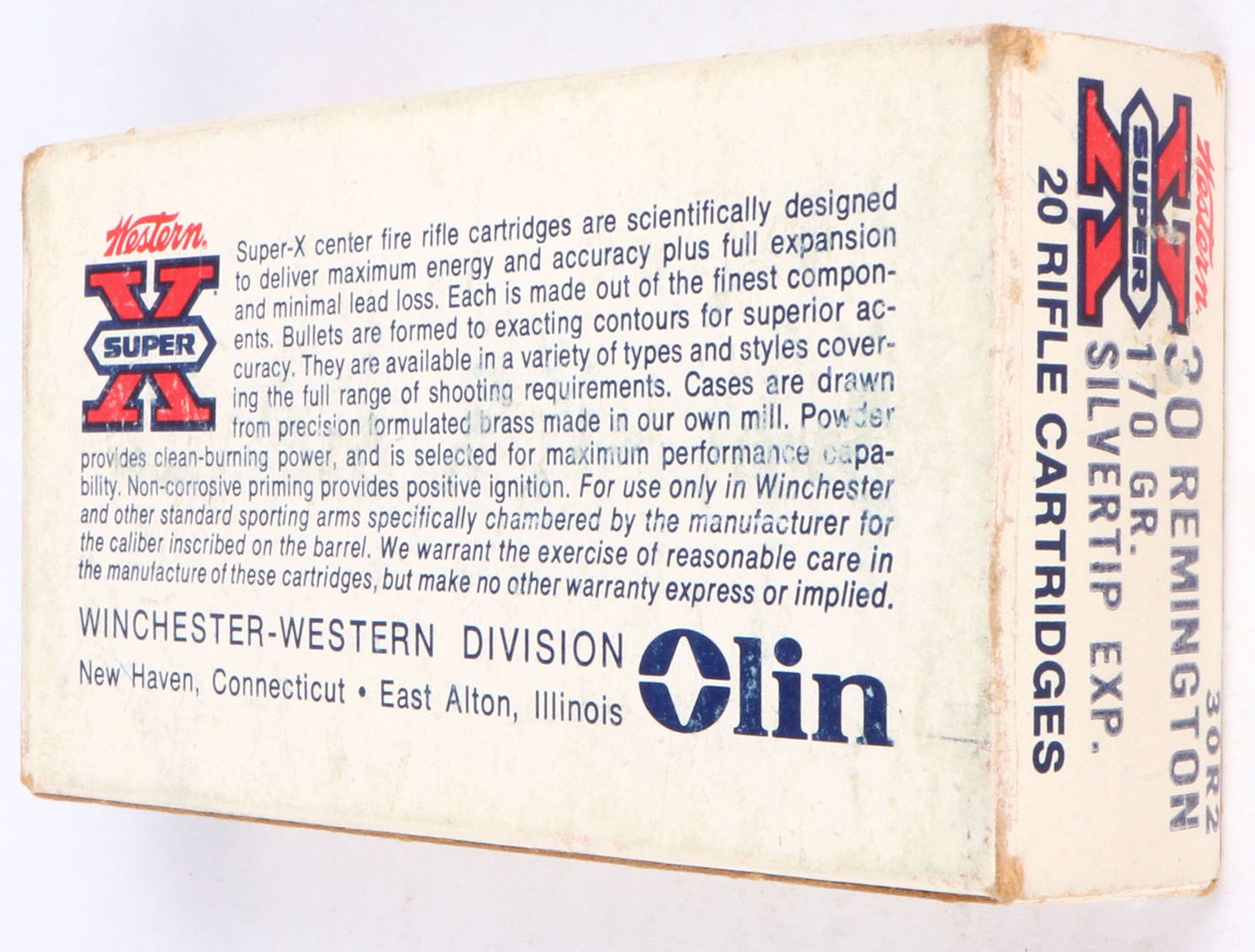 Western, Super-X, .30 Remington, 170 Gr. Silvertip EXP Bullet, 1pc, Full, white box with black/red print, box is solid with light rub marks, & light edge wear, ammo is excellent. Grade: Excellent - Value: 30 to 90