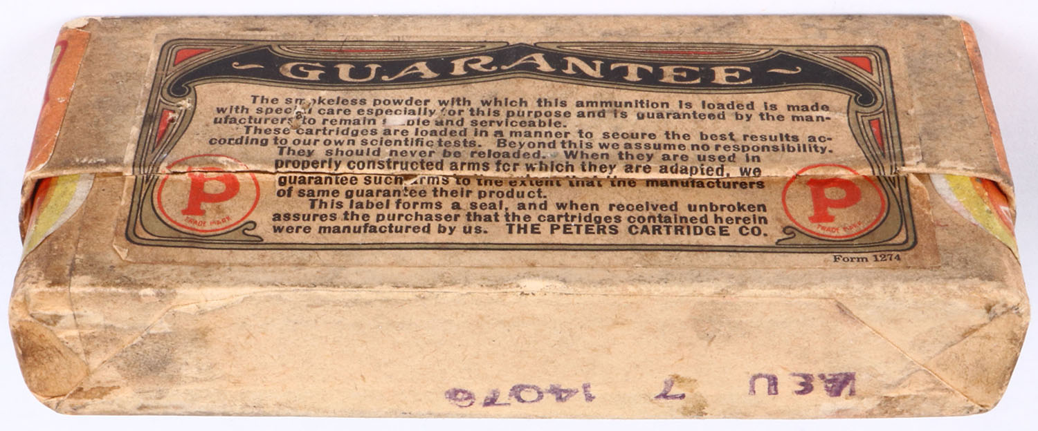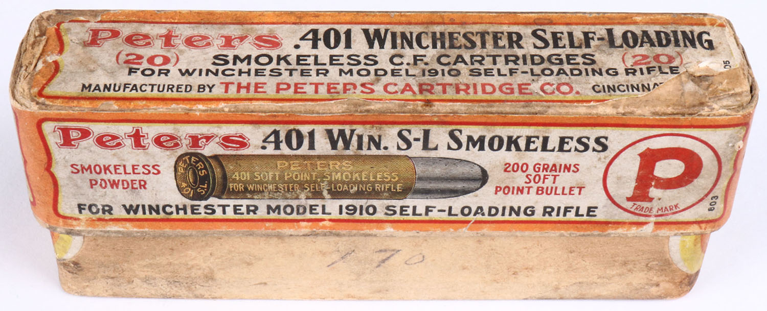 Peters, .401 Winchester Self-Loading, 200 Gr. Soft Point Bullet, Smokeless, 2pc, Full, buff box with orange/red/yellow/white label & black/red print, box is solid with age soiling, tear in top label, pencil marks, light rub marks & light edge/corner wear, ammo ranges from very good to good. Grade: Very Good ++ - Value: 50 to 100