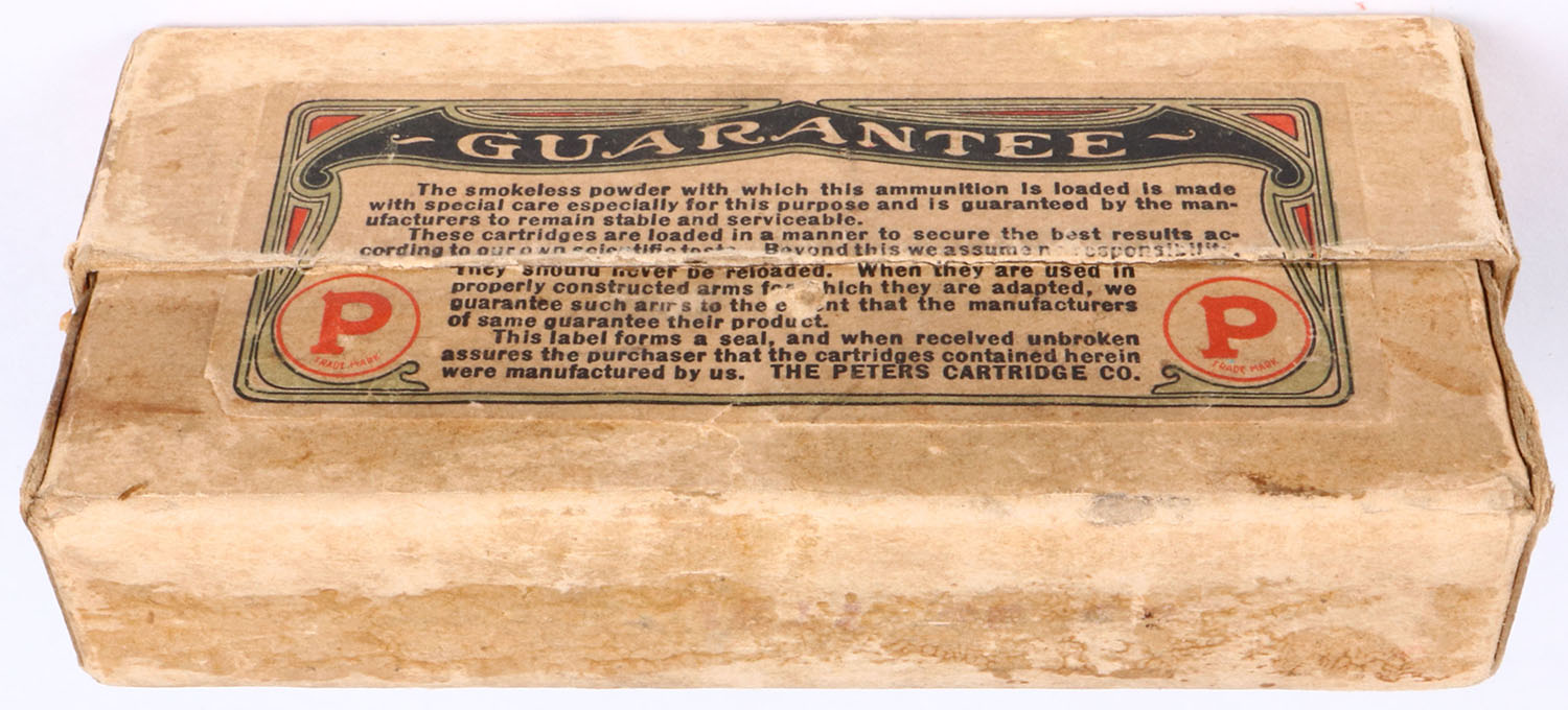 Peters, .30-30, 170 Gr. Metal cased Bullet, Smokeless, 2pc, Full, buff box with orange/red/yellow/white label & black/red print, box is solid with light age soiling, light rub marks & light edge/corner wear, ammo is very good. Grade: Very Good ++ - Value: 30 to 120