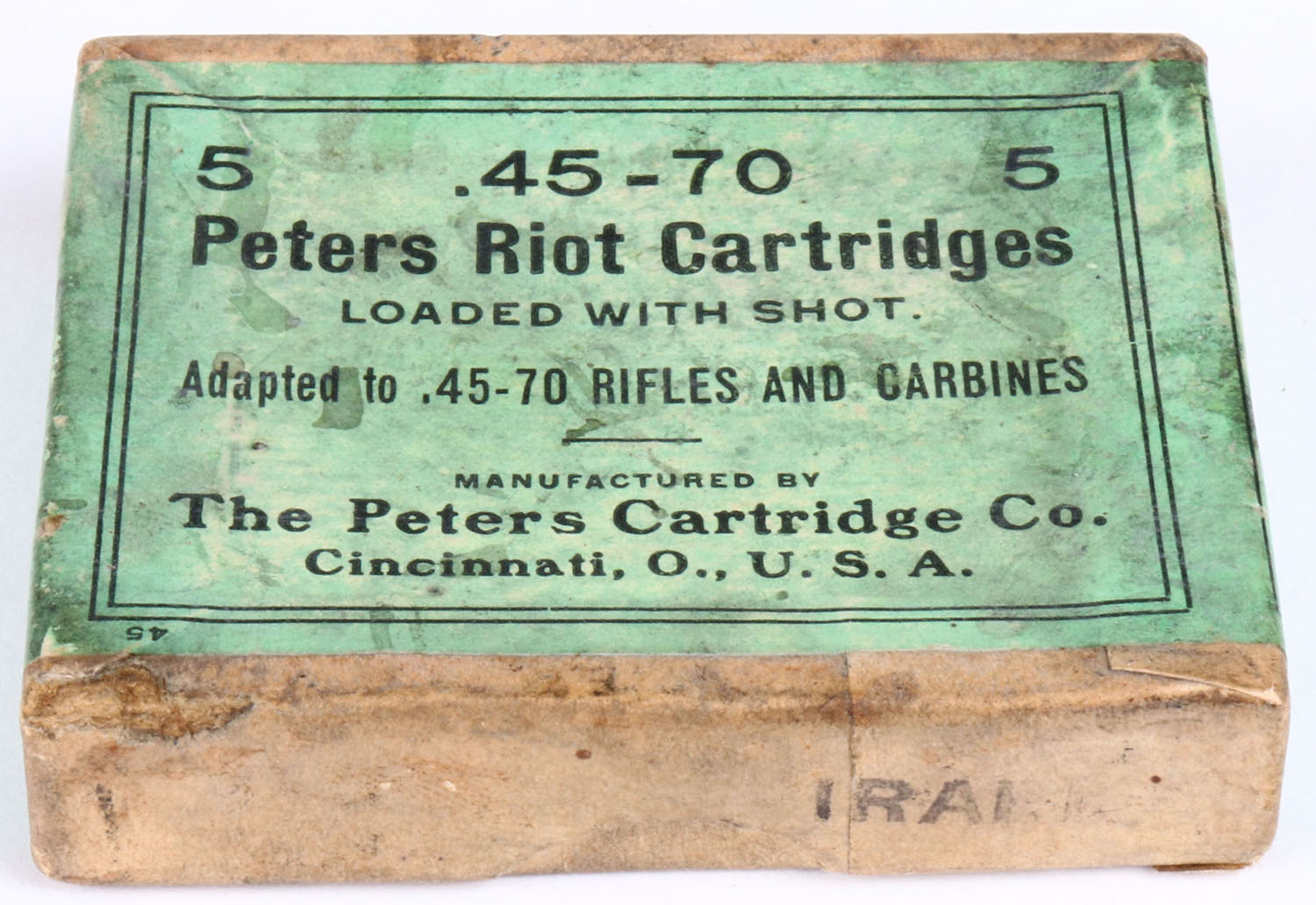 RARE!! Peters, .45-70 Peters Riot Cartridges, Loaded With Shot, 2pc, FULL & SEALED, buff box with green label & black print, box is solid with age soiling, light rub marks, & light edge wear. Grade: Very Good ++ - Value: 100 to 300