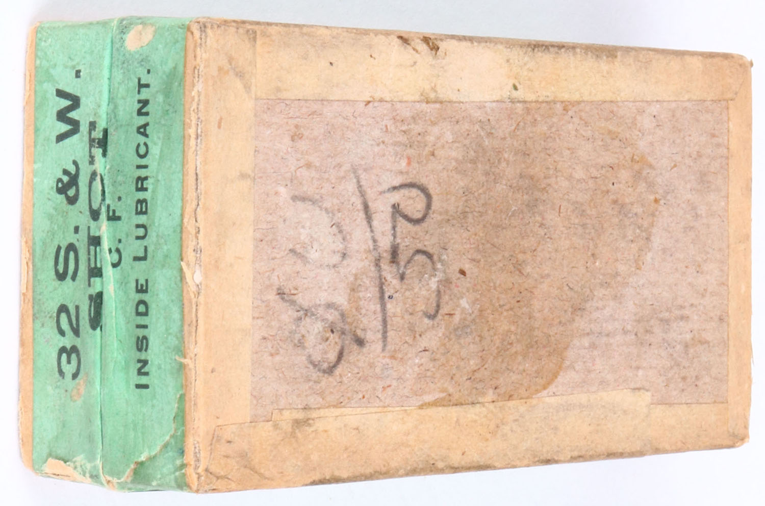 Peters, .32 S.&W. SHOT, Solid Head, Chilled shot, Inside Lubricant, 2pc, FULL & SEALED, buff box with green label & black print, box has one split end seam on right end, two torn seams on right end on top, pencil marks, light age soiling, & light edge wear. Grade: Very Good ++ - Value: 30 to 90