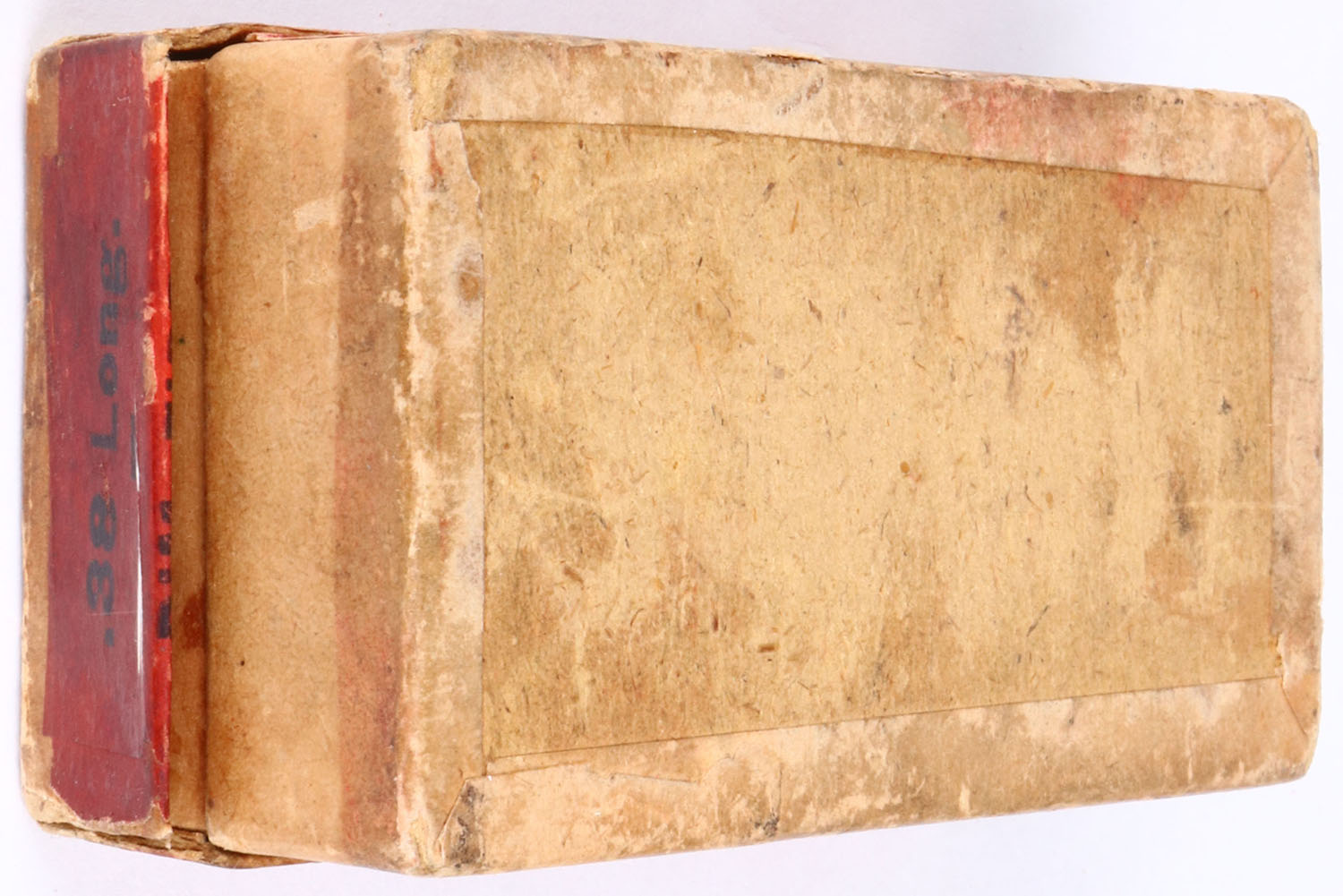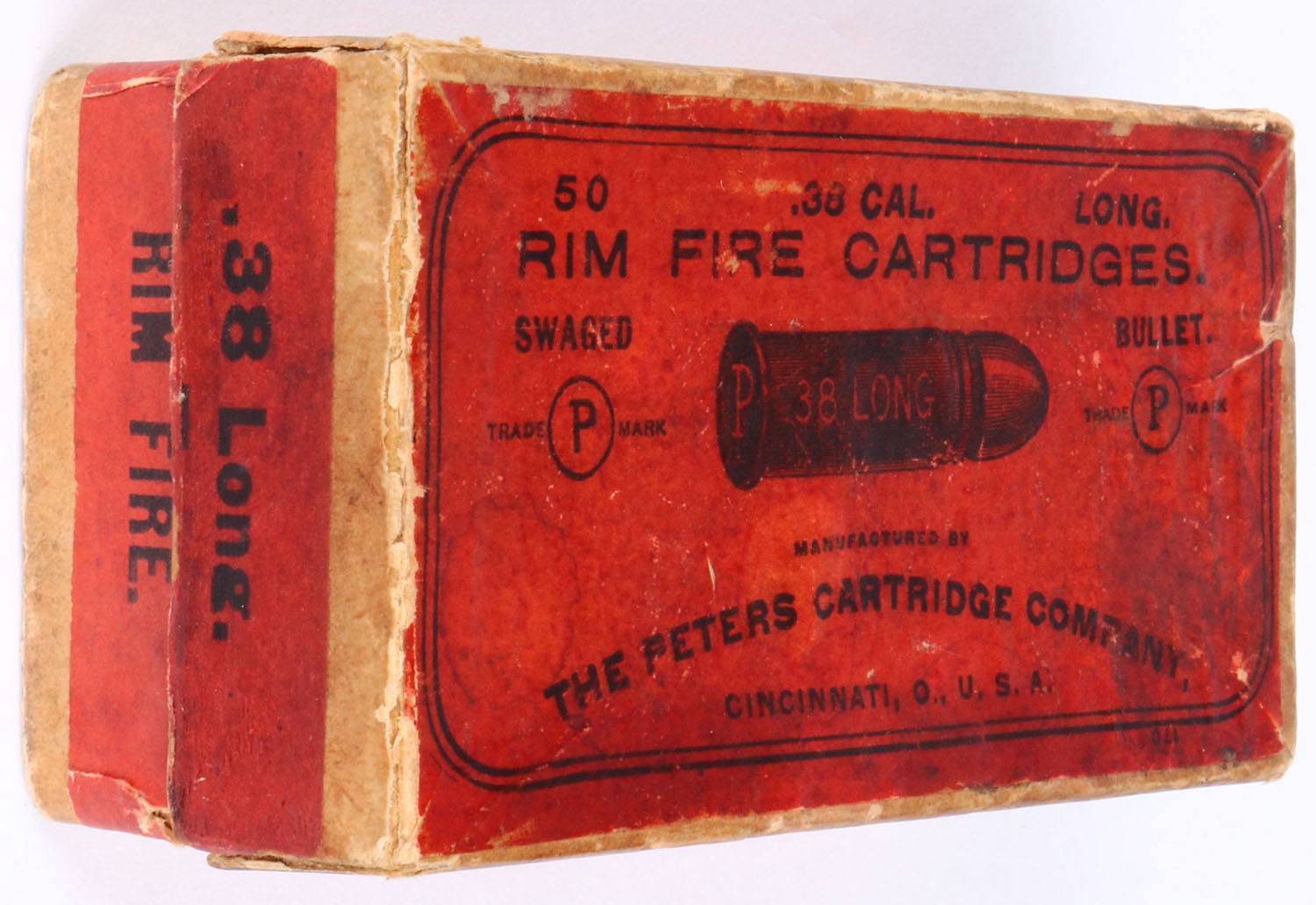 Peters, .38 Long, R.F., Swaged Bullet, 2pc, Full, buff box with red label & black print, box has four corner seam splits on lid, age soiling, rub marks, & edge wear, ammo is good. Grade: very good ++ - Value: 30 to 90