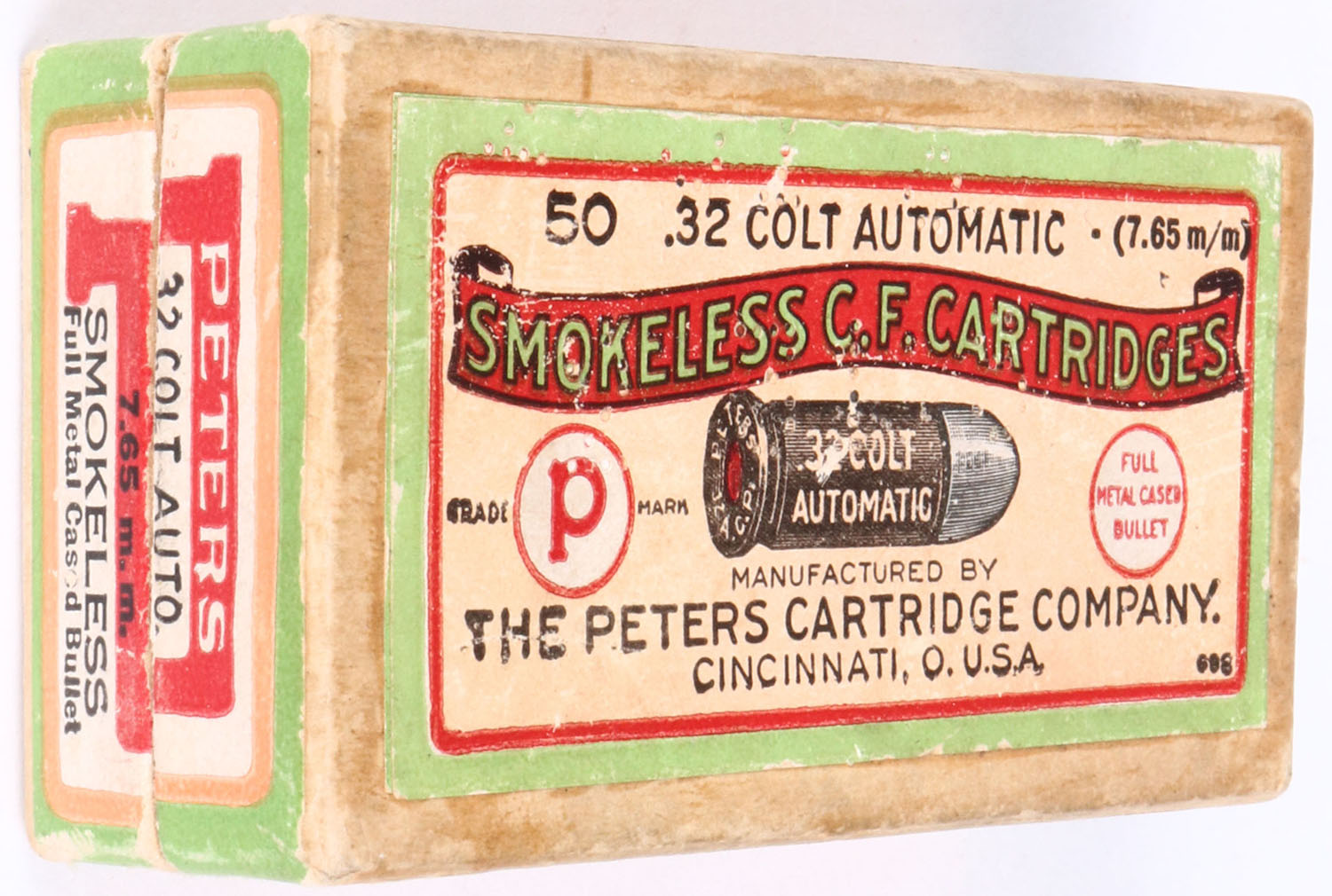 Peters, .32 Colt Automatic, Full Metal cased bullet, smokeless, 2pc, Partial 33 Rds., buff box with green/red/buff label & black print, box is solid with rub marks & light edge/corner wear, ammo is very good. Grade: Excellent - Value: 20 to 60