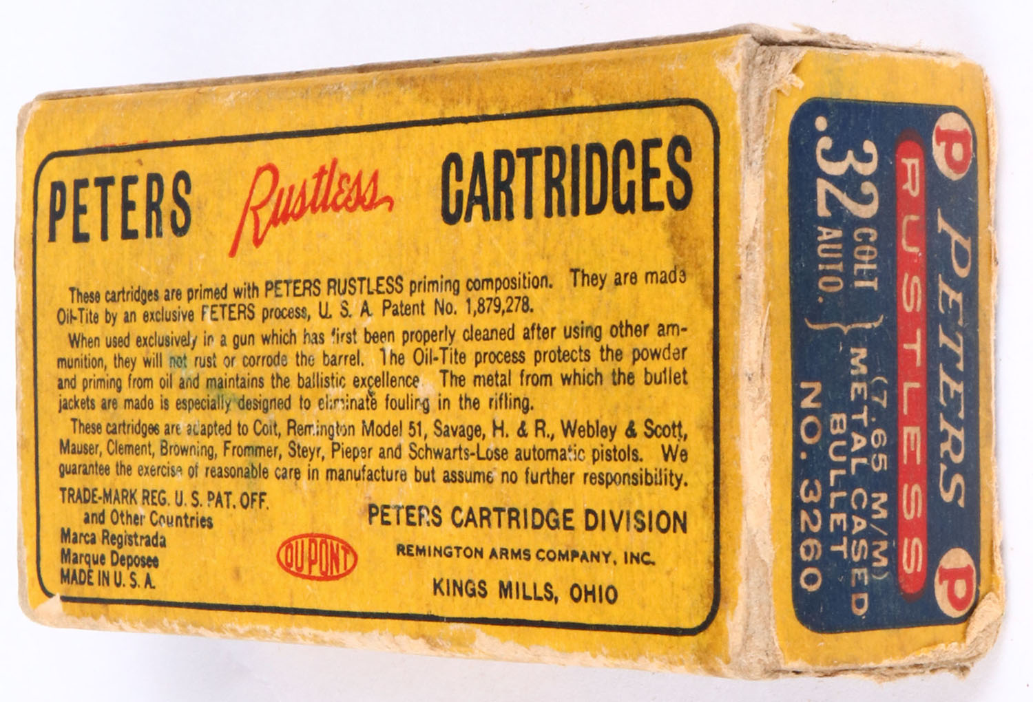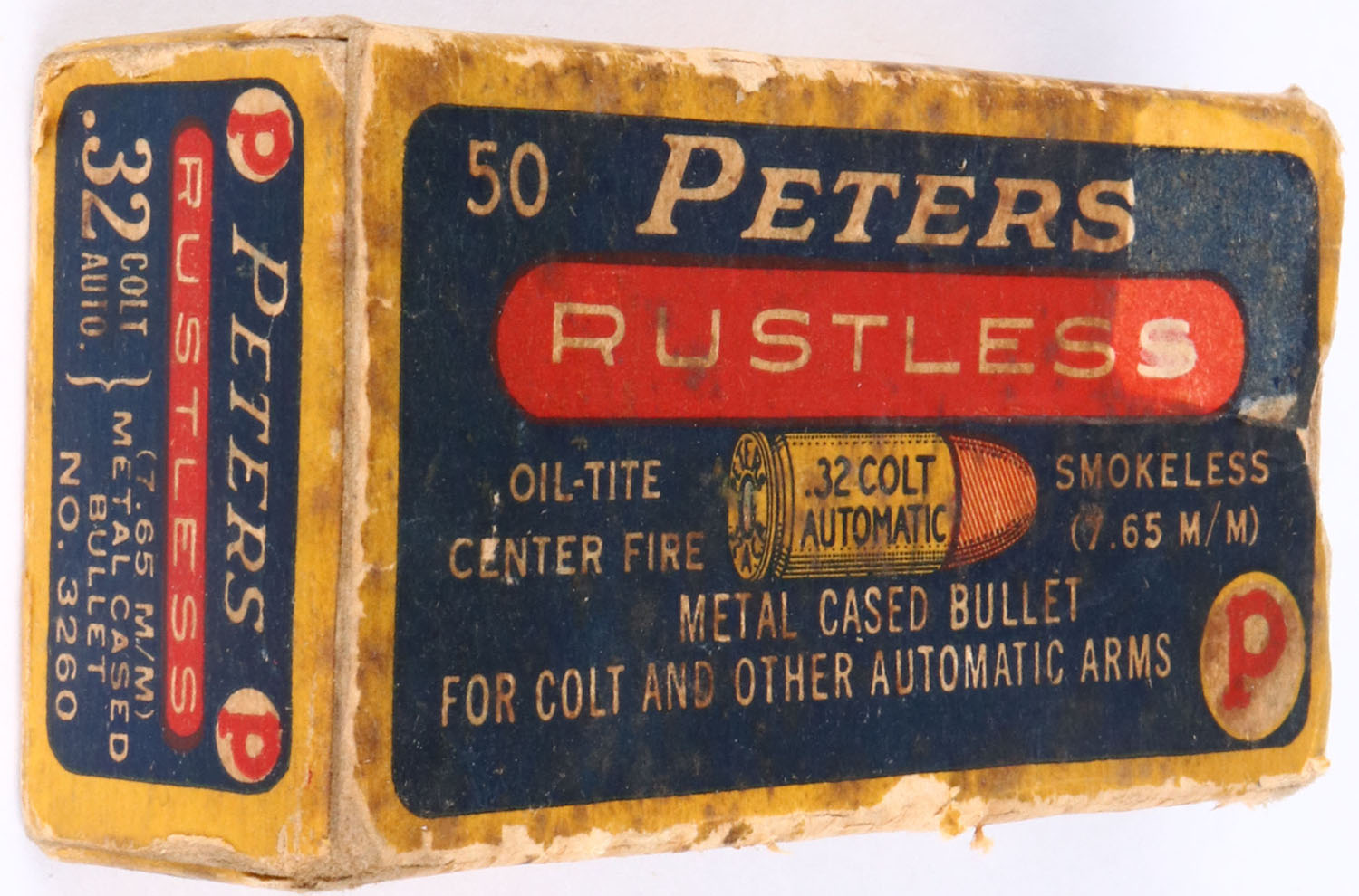 Peters, Rustless, .32 Colt Automatic, Smokeless, Metal cased bullet, 1pc, Full of incorrect ammo, yellow box with blue/red label & white/black print, box is solid with sticker mark on face, age soiling, rub marks, edge wear, & handling wear, ammo is very good. Grade: Very Good + - Value: 10 to 50