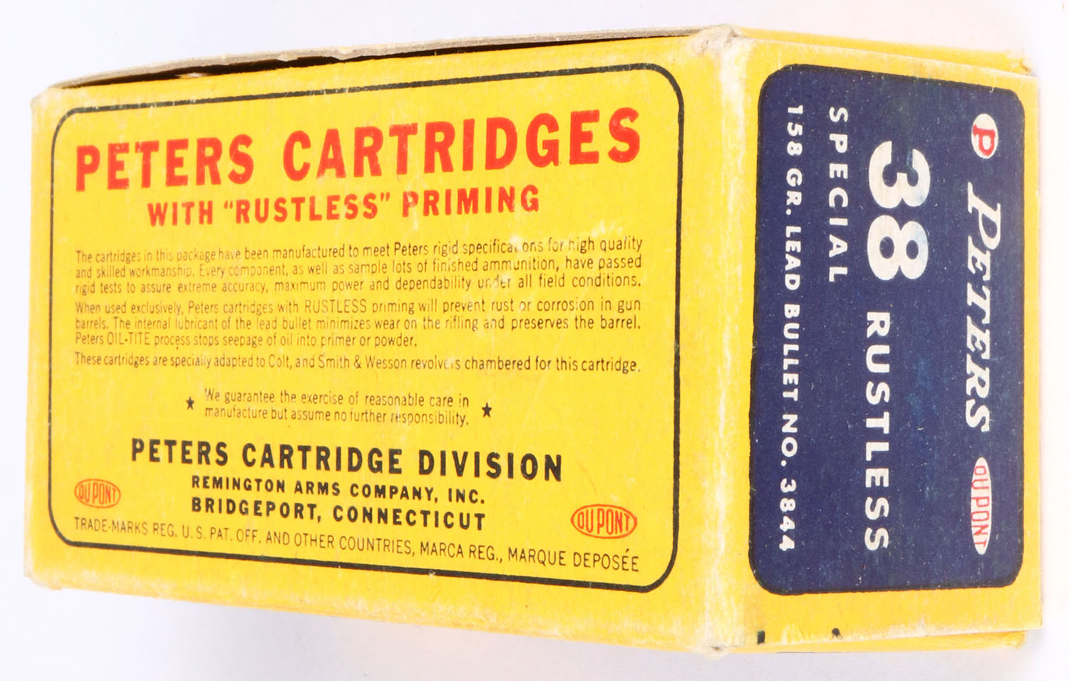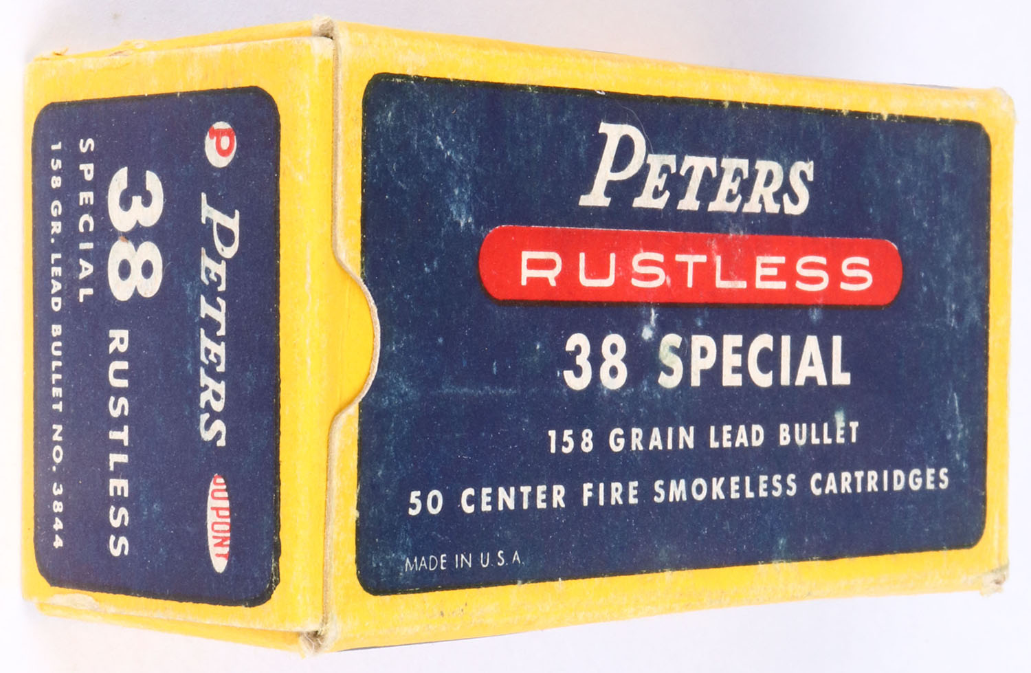 Peters, Rustless, .38 Special, 158 Gr. Lead Bullet, 1pc, Full, yellow box with blue/red label & white/black print, box is solid with light rub marks, & light edge wear, ammo is excellent. Grade: Excellent + - Value: 40 to 80