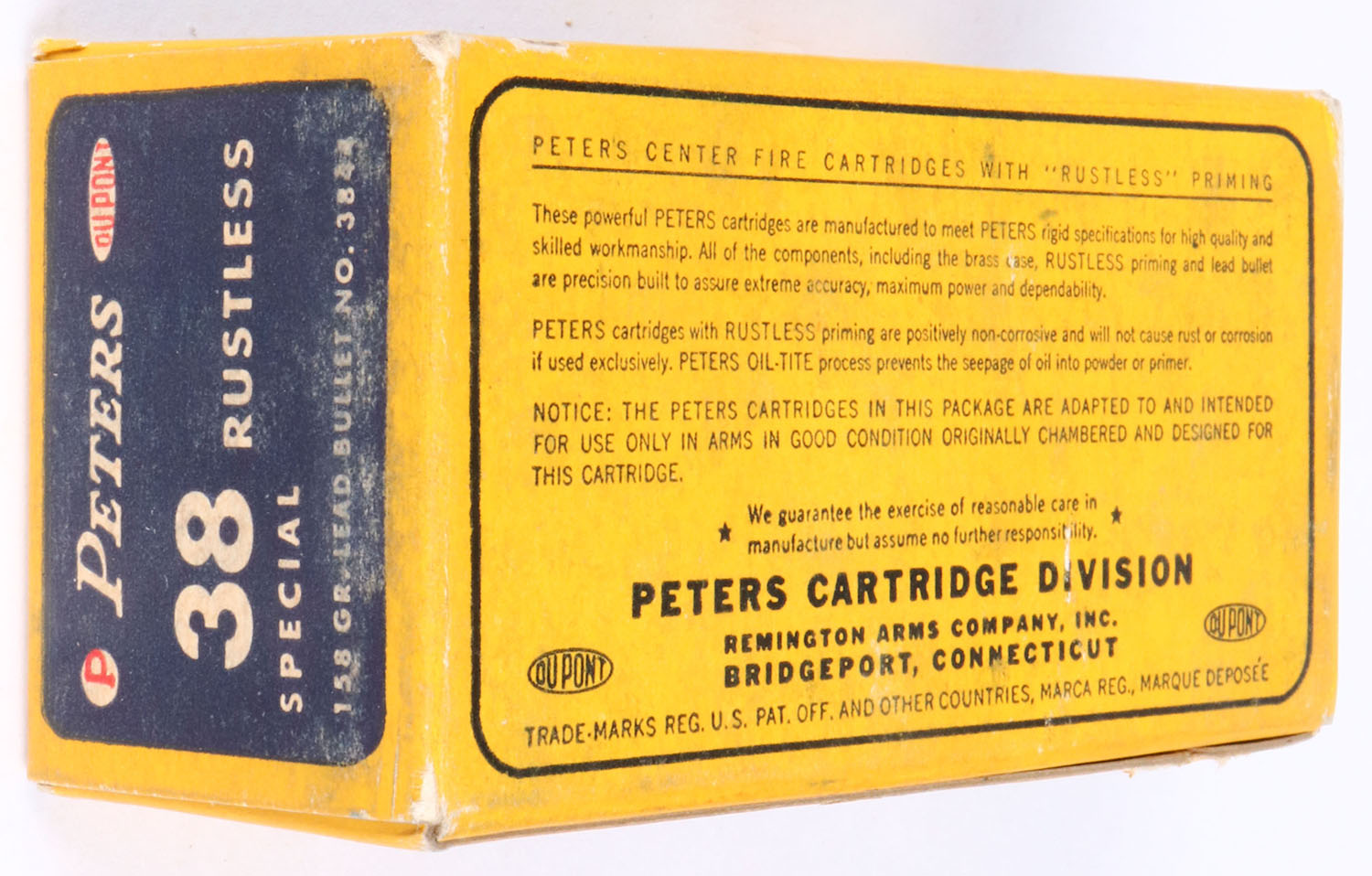 Peters, Rustless, .38 Special, 158 Gr. Lead Bullet, 1pc, Full, yellow box with blue/red label & white/black print, box is solid with light rub marks, & light edge wear, ammo is excellent. Grade: Excellent - Value: 40 to 80