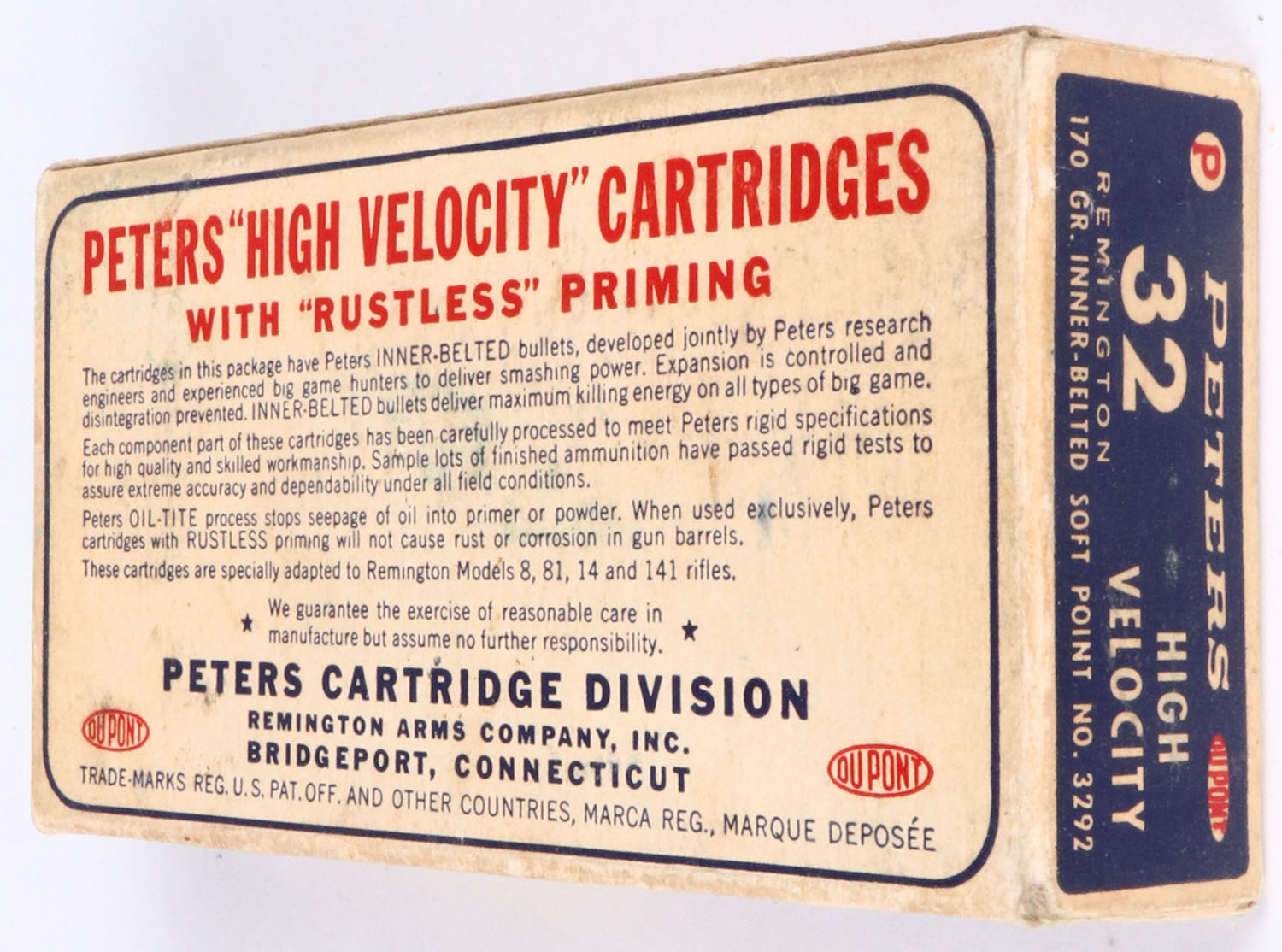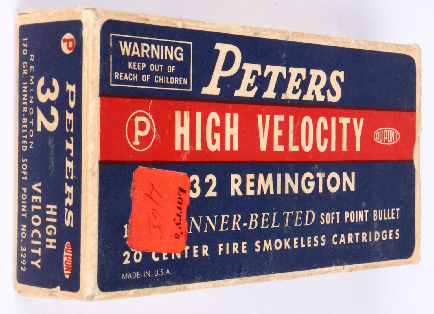 Peters, High Velocity, .32 Remington, 170 Gr Inner-Belted soft point Bullet, 1pc, partial 14 Rds., yellow box with blue/red label & white/black print, box is solid with light rub marks, & light edge wear, ammo is very good. Grade: Excellent - Value: 20 to 60