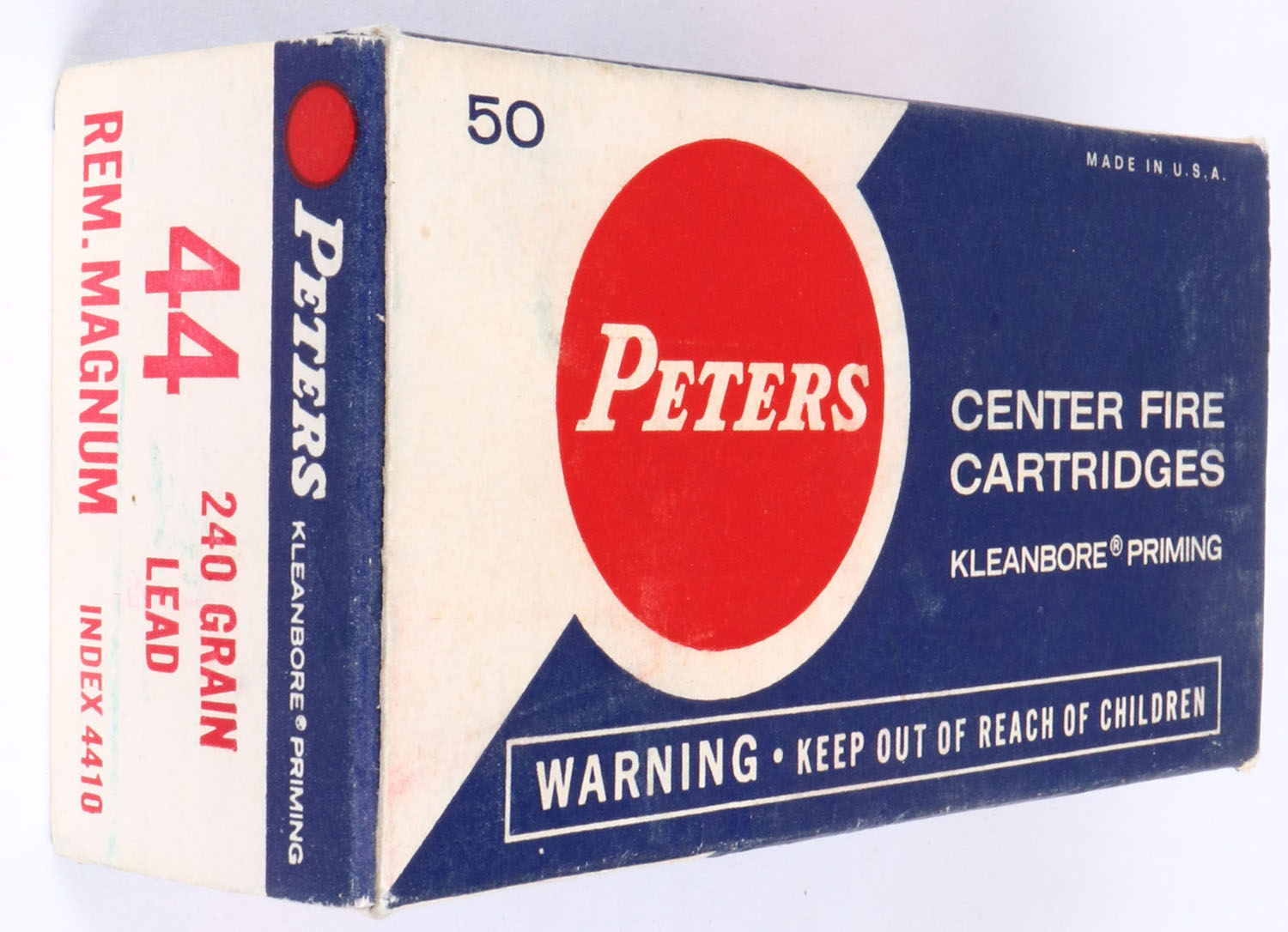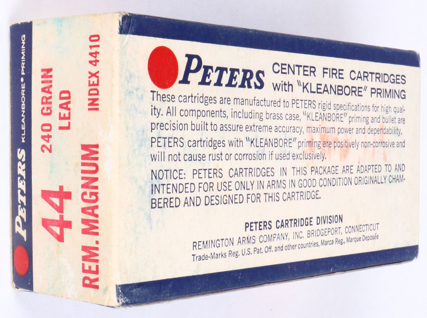 Peters, .44 Rem. Magnum, 240 Gr. Lead bullet, 1pc, Full, blue/white box with red logo & white/red print, box is solid with minor age soiling, rub marks, light edge wear, ammo is excellent. Grade: Very Good ++ - Value: 40 to 80
