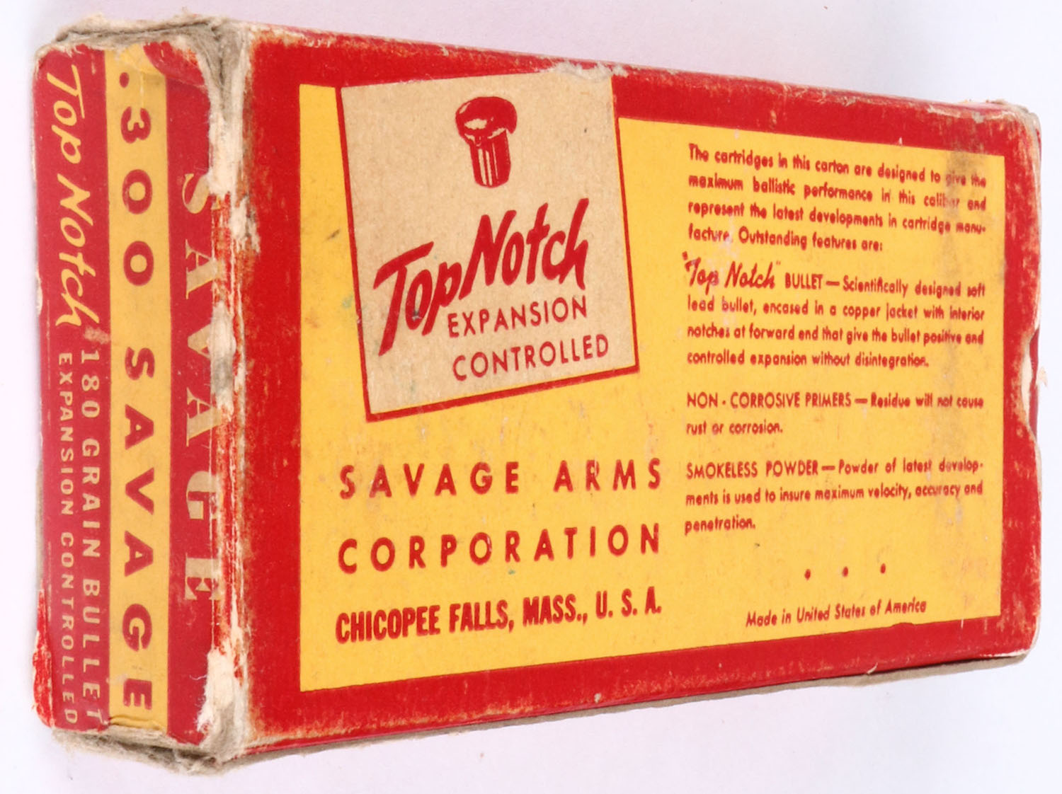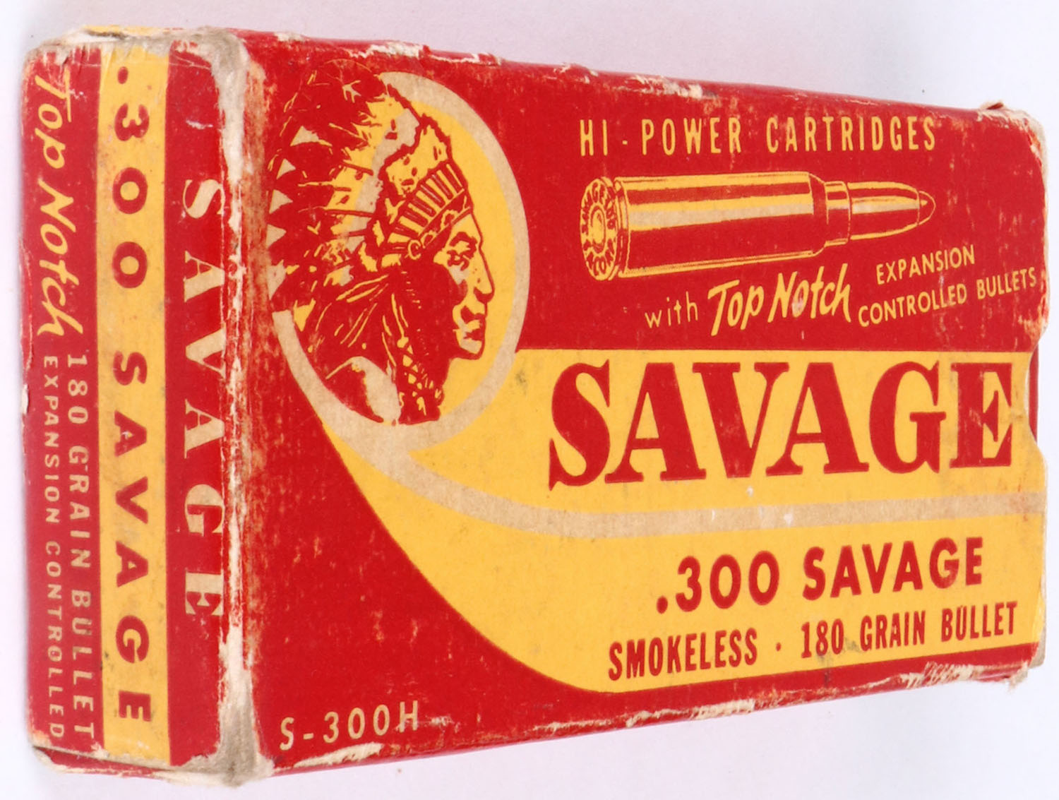 Savage, .300 Savage, 180 Gr. Top Notch Expansion Controlled Bullet, 1pc, Partial 18 Correct Rds., 2 R-P Rds., red box with yellow label & red/yellow print, box is solid with rub marks, & edge wear, ammo is very good . Grade: Very Good + - Value: 60 to 120