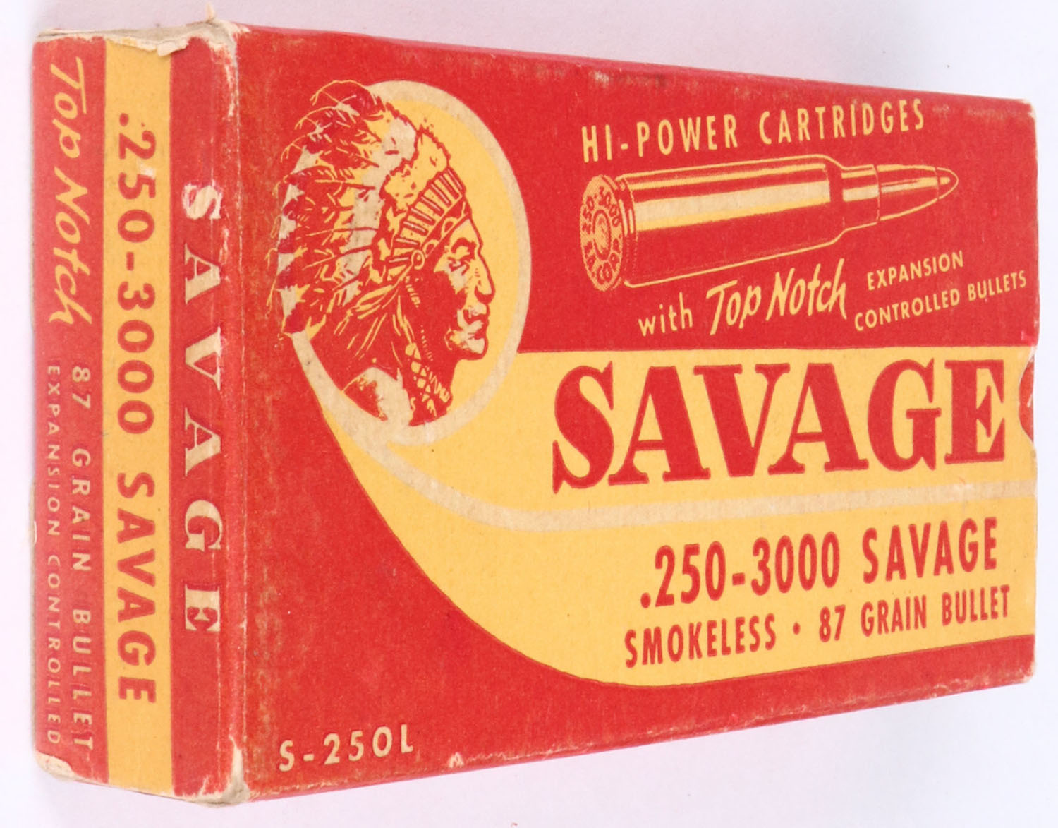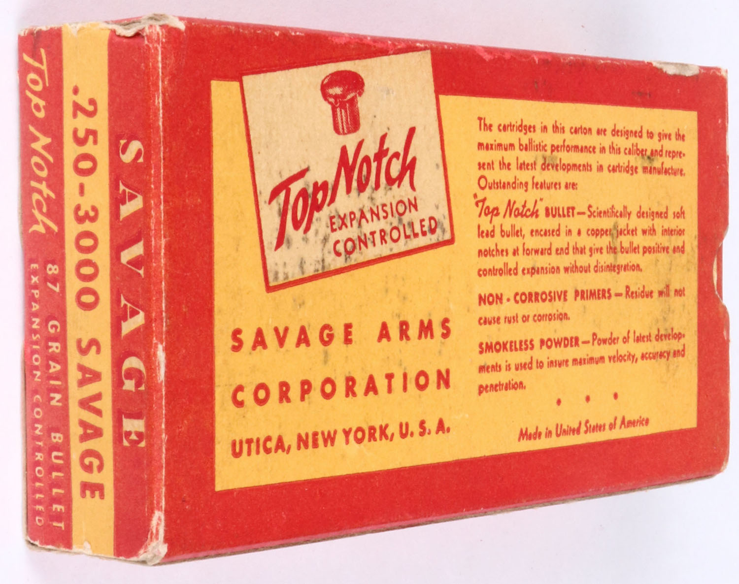 Savage, .250-3000 Savage, 87 Gr. Top Notch Expansion Controlled Bullet, 1pc, Full, red box with yellow label & red/yellow print, box is solid with minor color fading, minor rub marks, & edge wear, ammo is very good. Grade: Very Good ++ - Value: 100 to 200