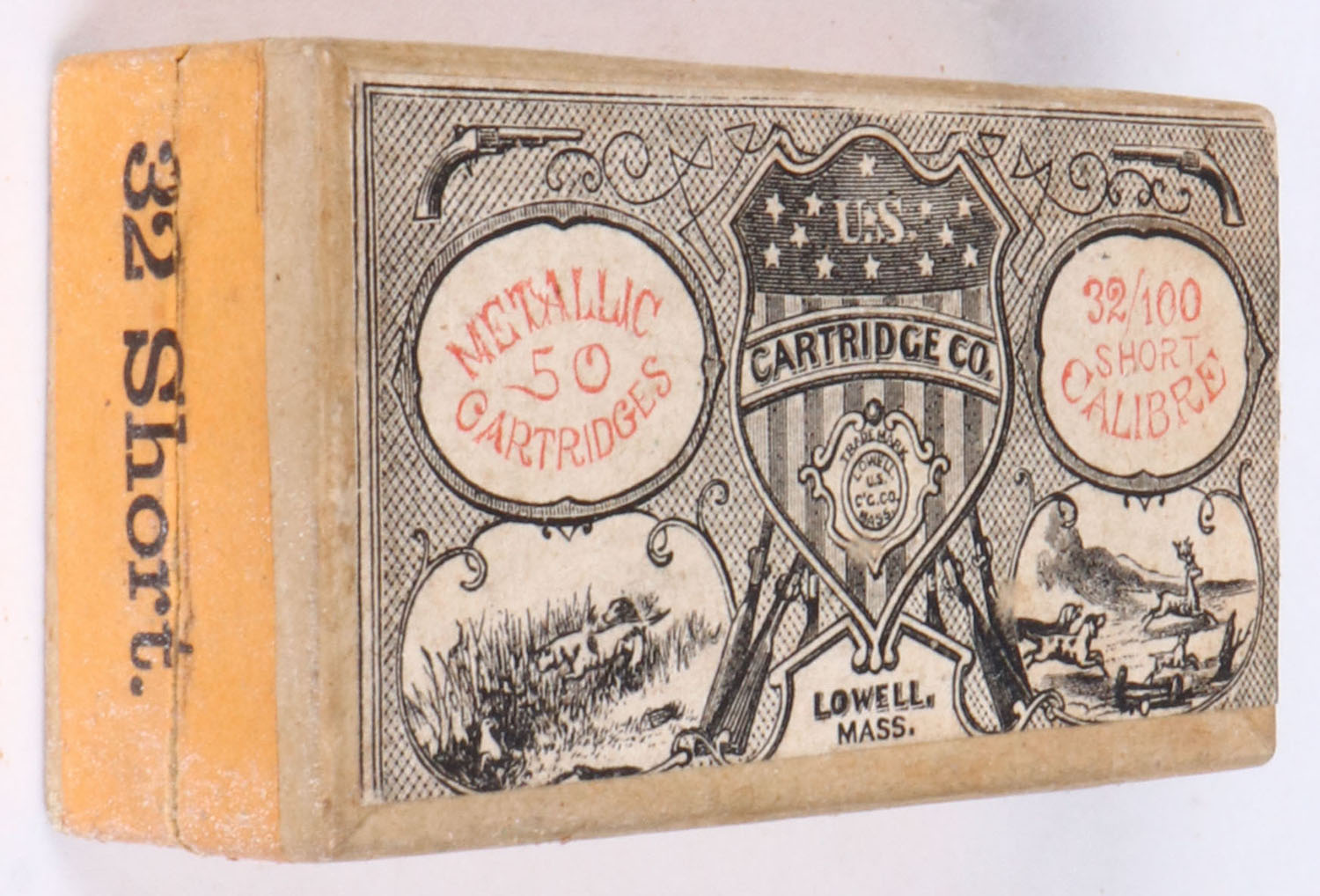 U.S. Cart. Co., .32/100 short, Target cartridges, 2pc, Full, buff box with images of shield & hunting scenes on top label, & black/red print, box is solid with very good color, & light wear, ammo is fair. Grade: Excellent ++ - Value: 100 to 200
