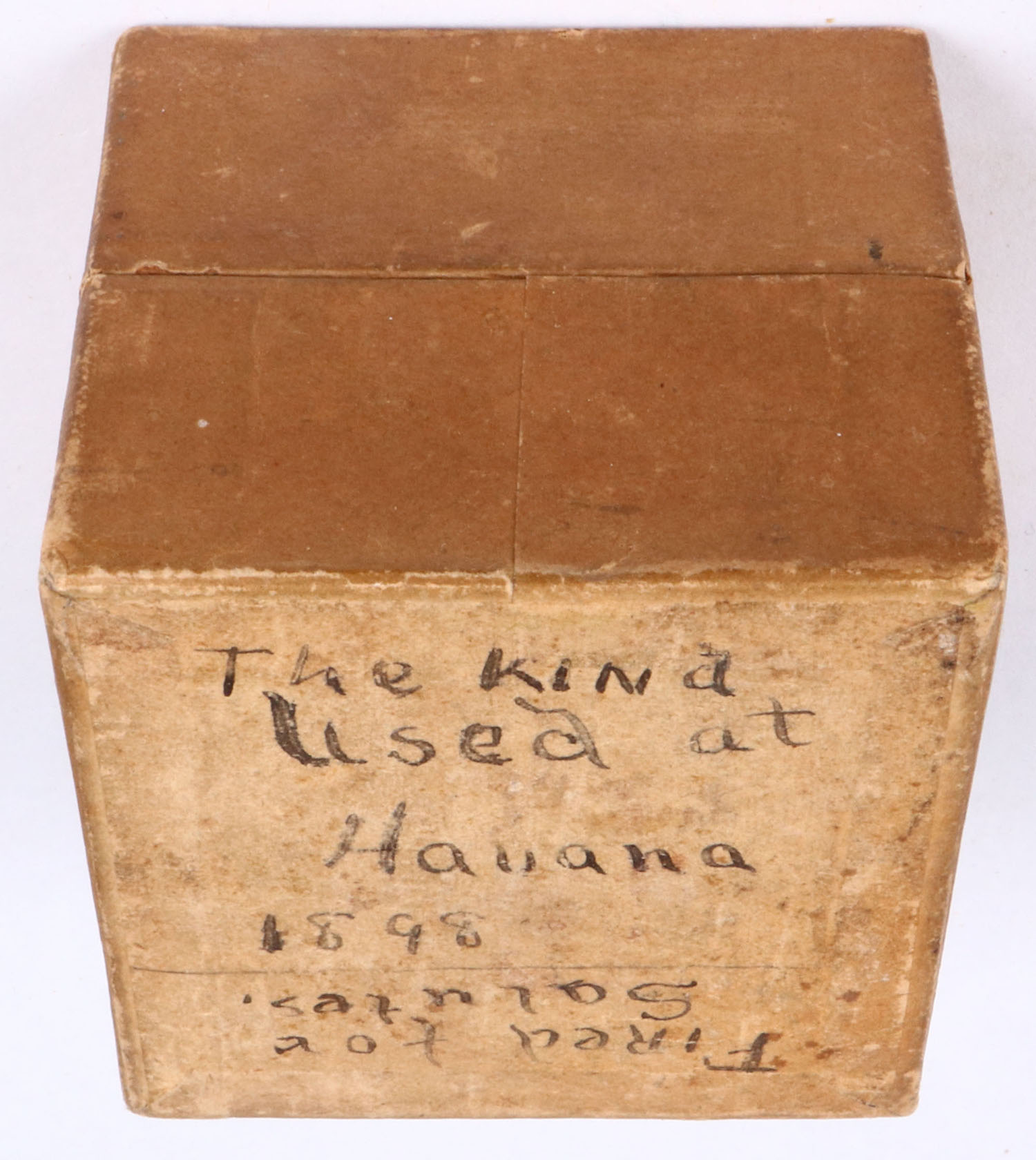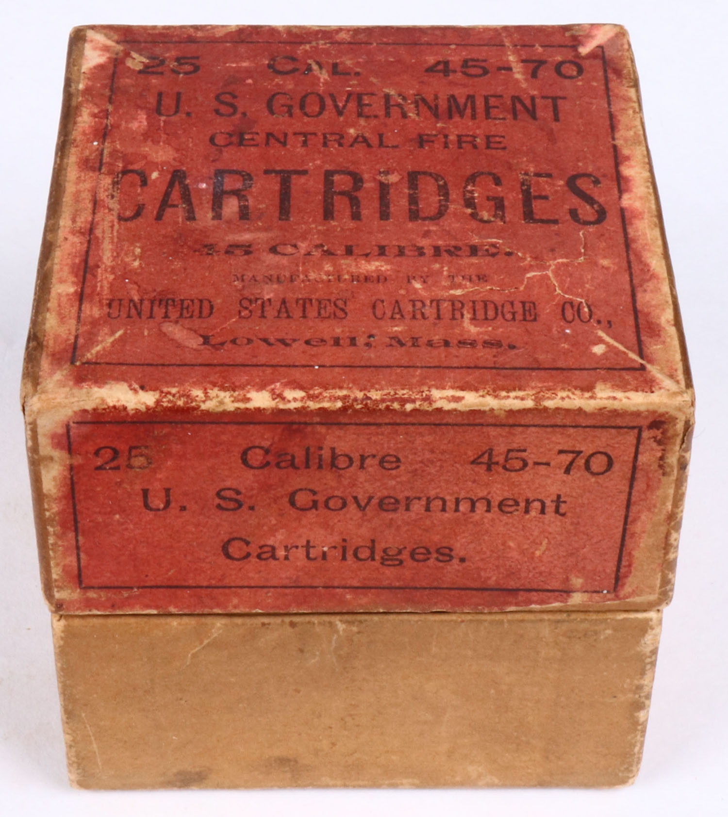 U.S. Cart. Co., .45-70 U.S. Government, 2pc, Partial 9 Rds., buff box with red label & black print, box is solid with minor stains, rub marks, & edge wear, ammo is very good. Grade: Very Good + - Value: 20 to 100