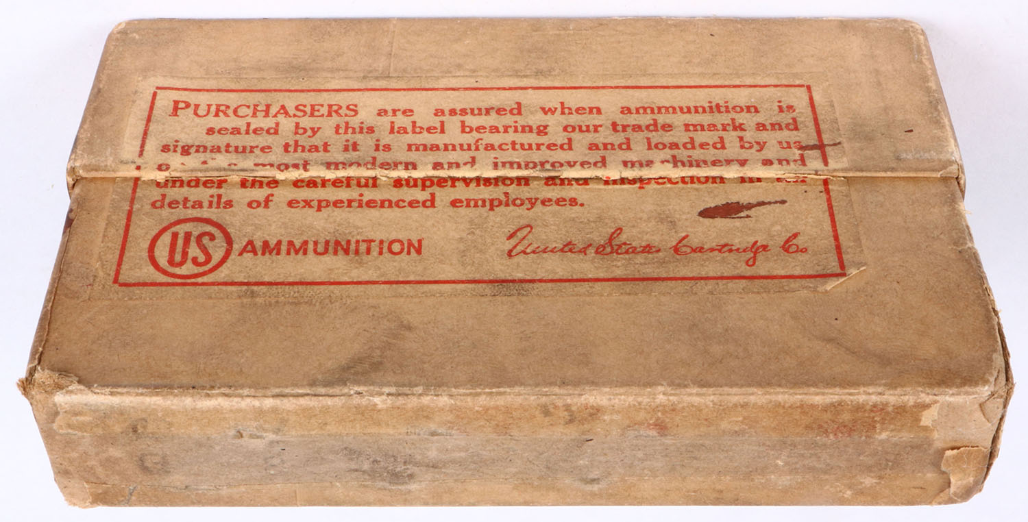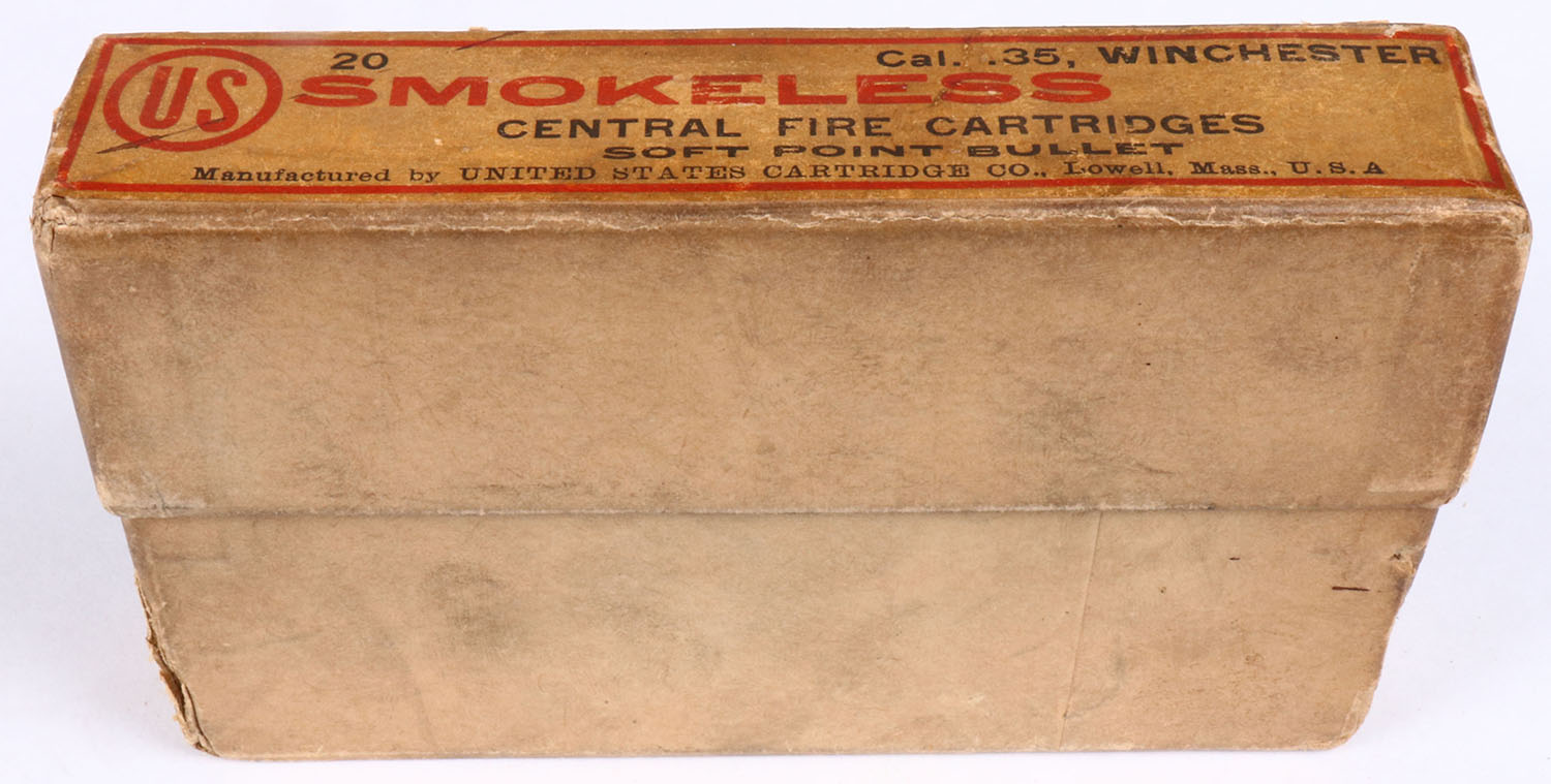 U.S. Cart. Co., .35 Winchester, smokeless, Soft point bullet, 2pc, Full, buff box with red/orange label & black/red print, box has two split seams on lid, light age soiling, light rub marks, & edge wear, ammo is very good. Grade: Very Good + - Value: 30 to 60
