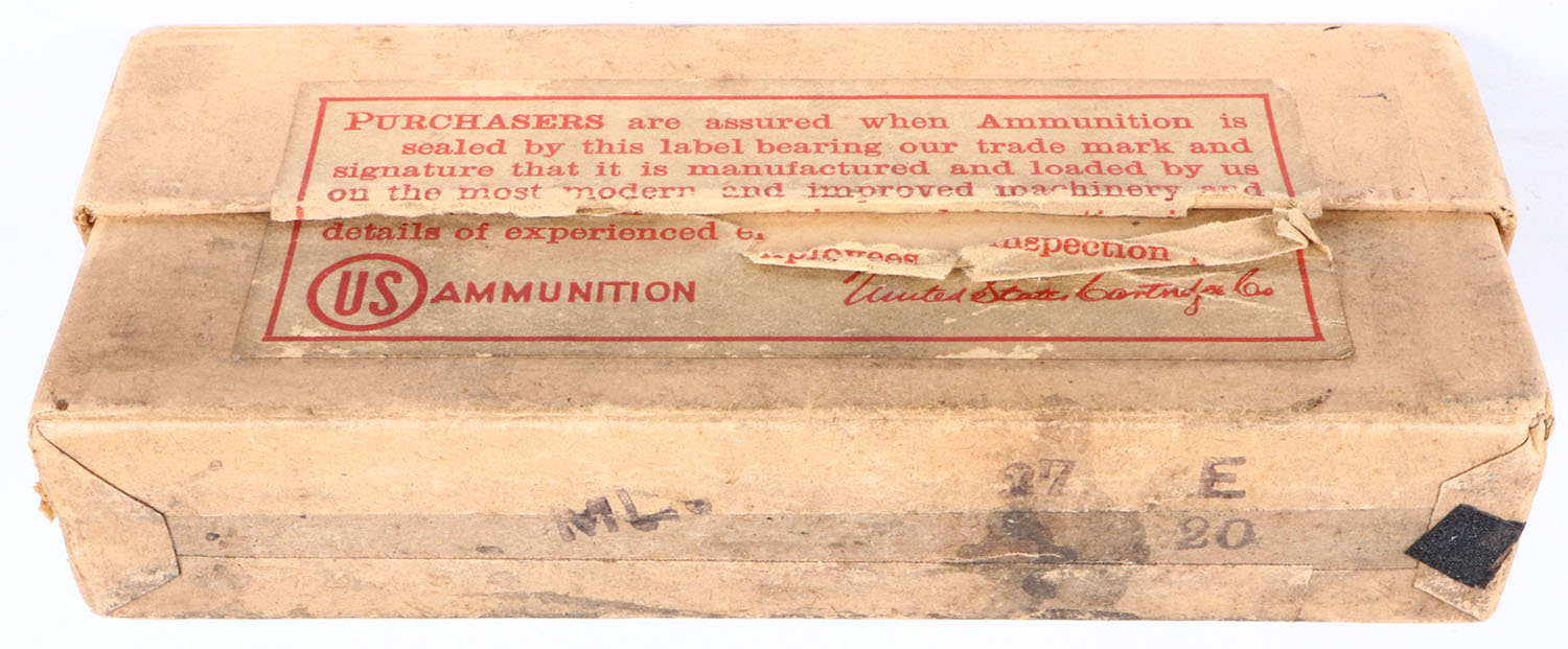 U.S. Cart. Co., ,45-70 U.S. Gov't, black powder, 405 Gr. Bullet, 2pc, Full, buff box with blue label, box is solid with light age soiling, rub marks &, edge wear, ammo is very good. Grade: Very Good ++ - Value: 40 to 80