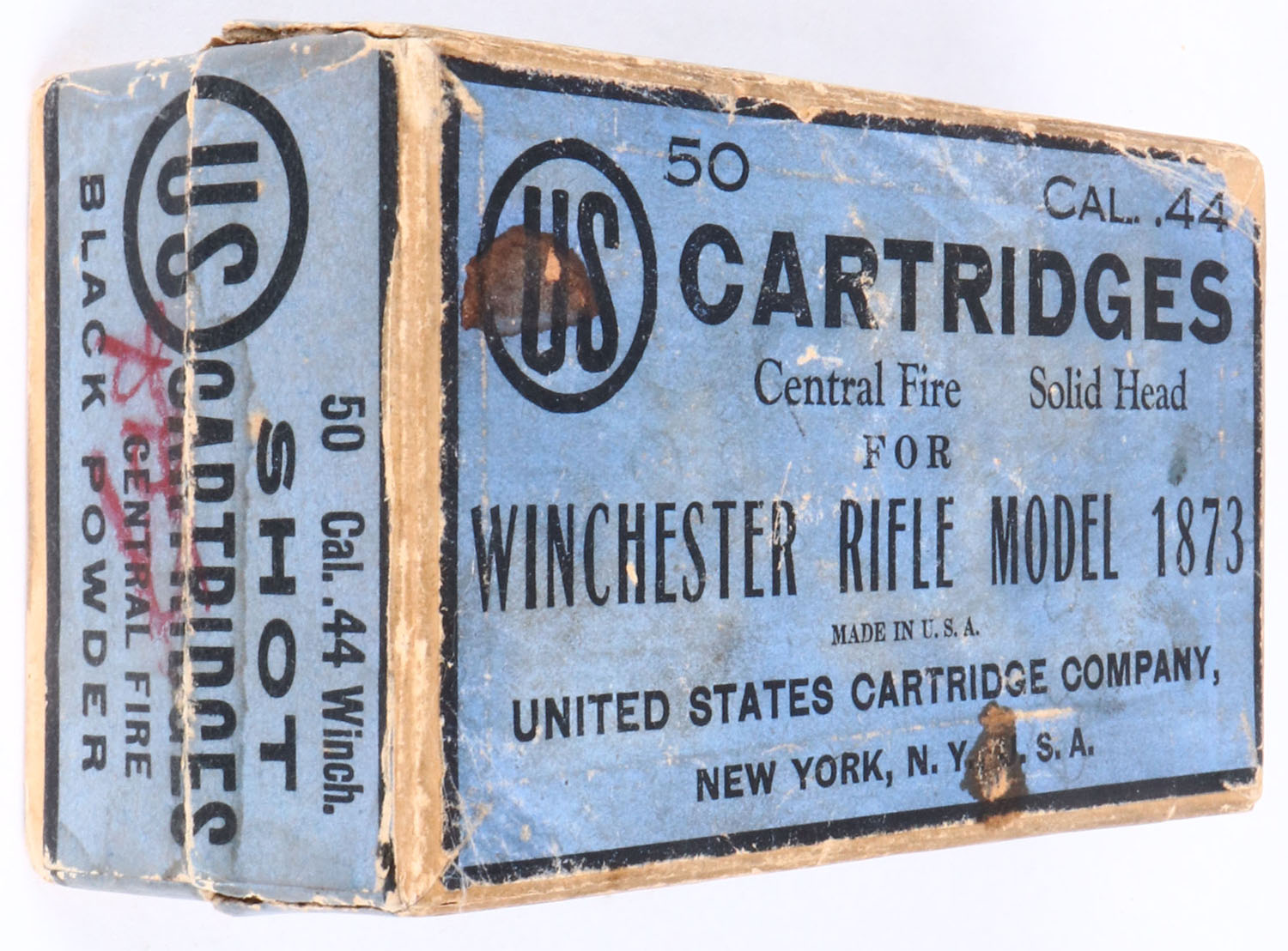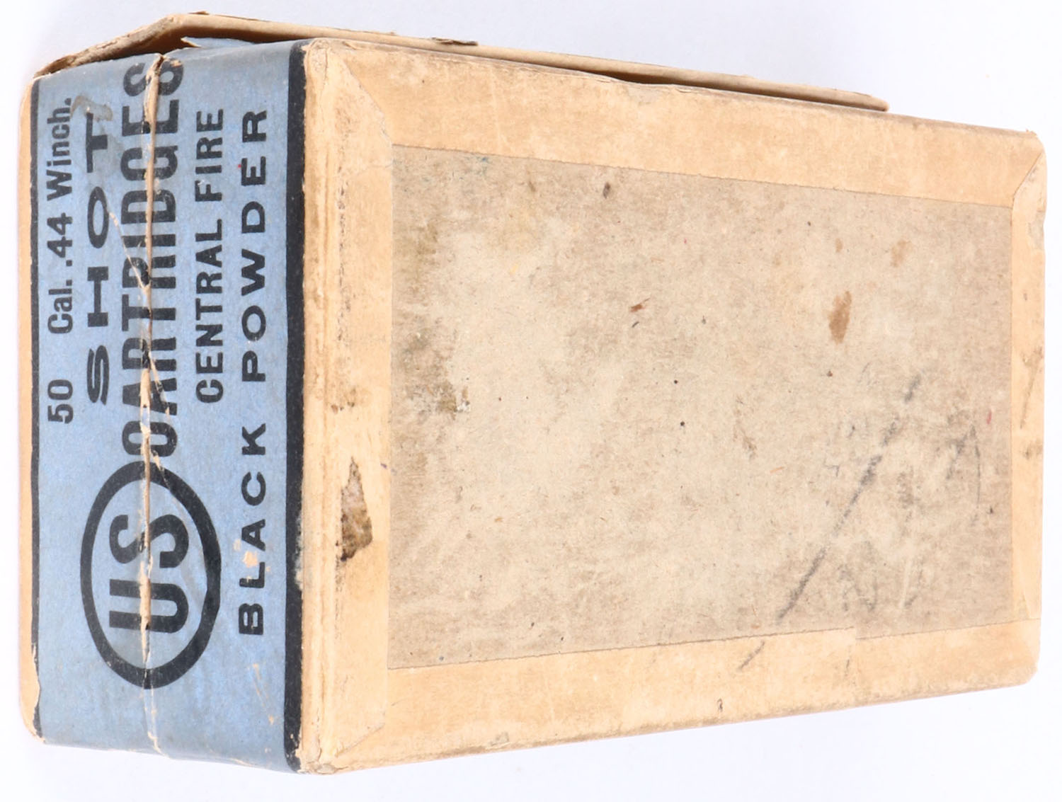 U.S. Cart. Co., ,44 Winchester (44-40) SHOT CARTRIDGES, black powder, 2pc, Full, buff box with blue label, box has two corner seam splits, stains, rub marks &, edge wear, ammo is very good. Grade: Very Good ++ - Value: 30 to 90