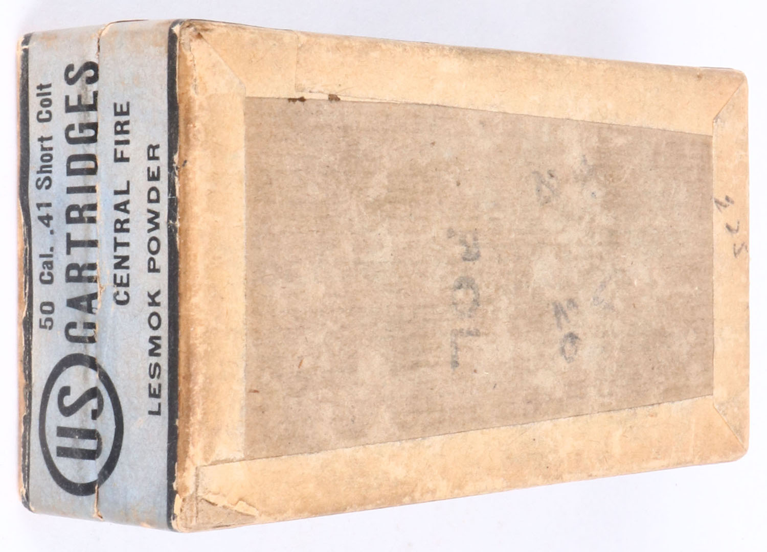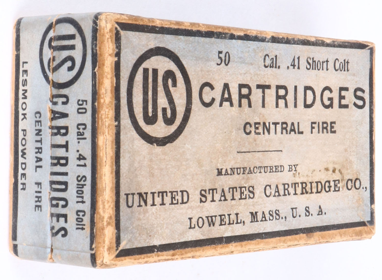 U.S. Cart. Co., .41 short colt, Lesmok powder, 2pc, Full, buff box with blue label, box is solid with light color fading, one side of seals still intact, light rub marks &, light edge wear, ammo is good. Grade: Very Good ++ - Value: 100 to 200