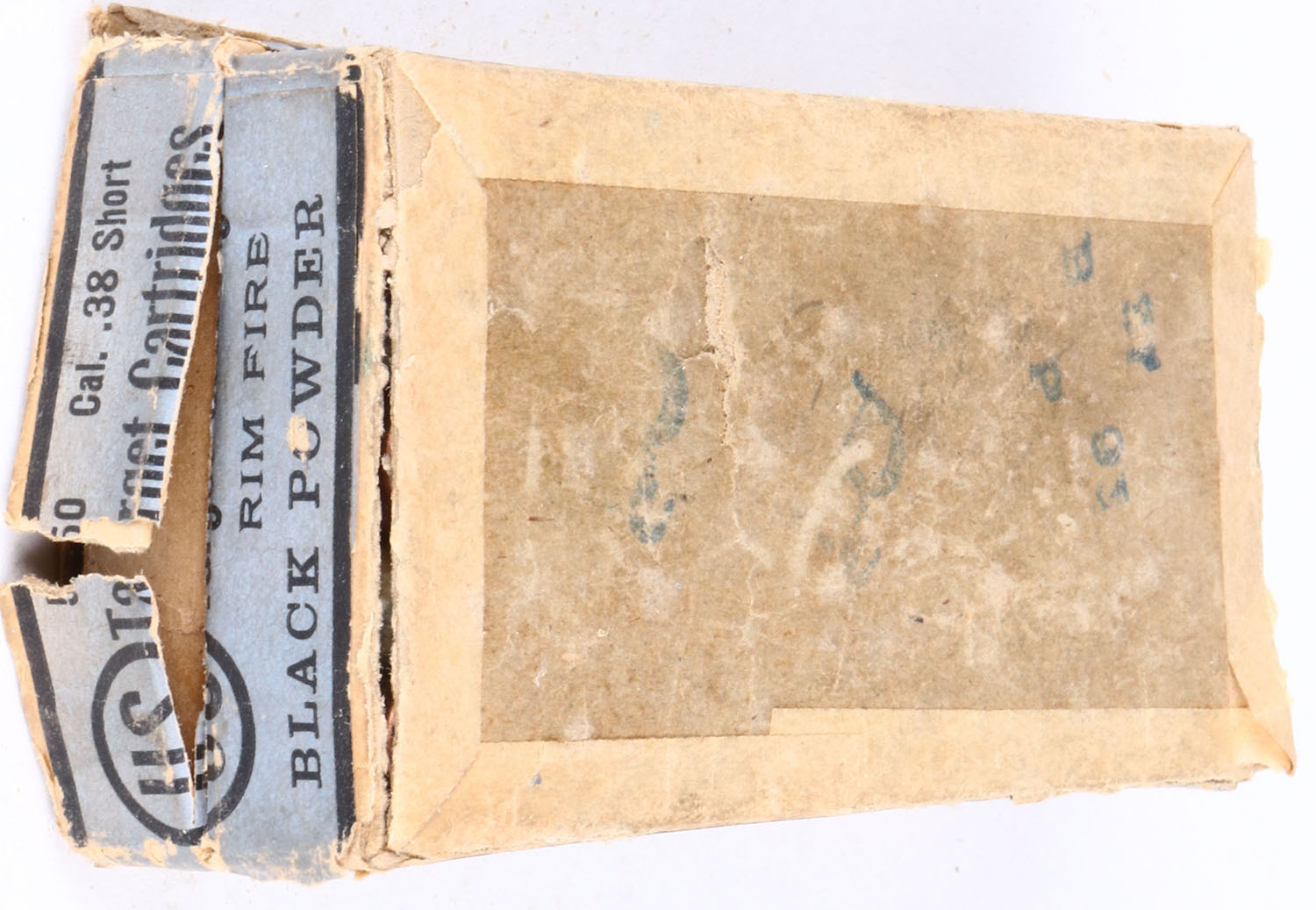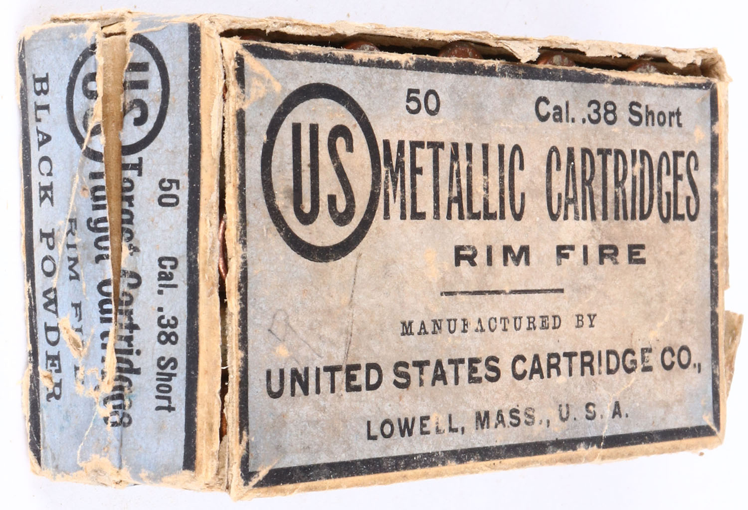 U.S. Cart. Co., .38 short, black powder, 2pc, Full, buff box with blue label, box is weak & falling apart multiple seam splits, light age soiling, rub marks, & edge wear, ammo is good. Grade: Good + - Value: 20 to 60