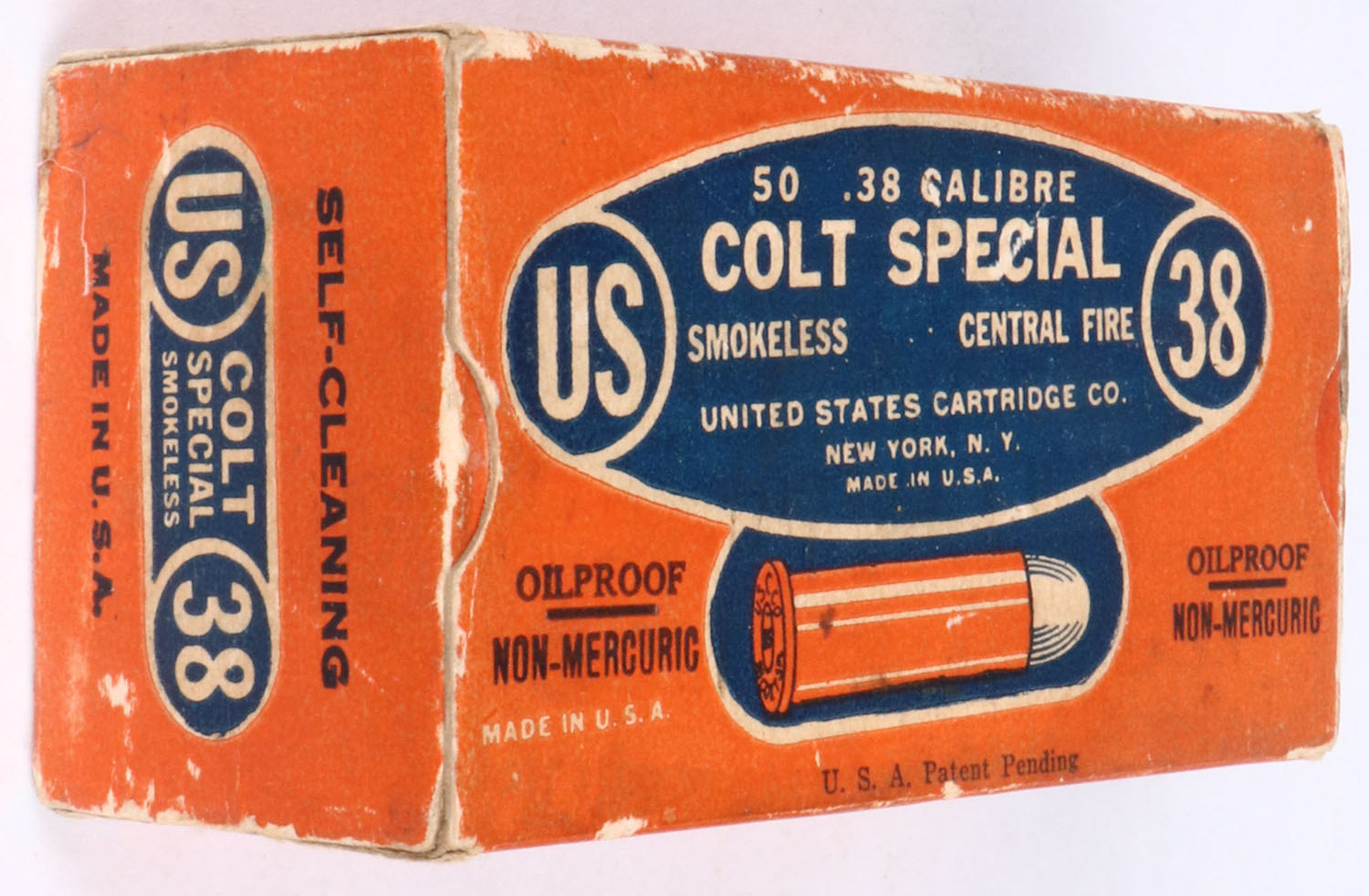 U.S. Cart. Co., .38 colt special (38 Special), smokeless, RIFLE, U.S.A. Patent Pending, 1pc, Full, buff box with orange/blue label & white/black print, box is solid with minor age soiling, light rub marks & light edge wear, ammo is very good. Grade: Very Good ++ - Value: 30 to 120